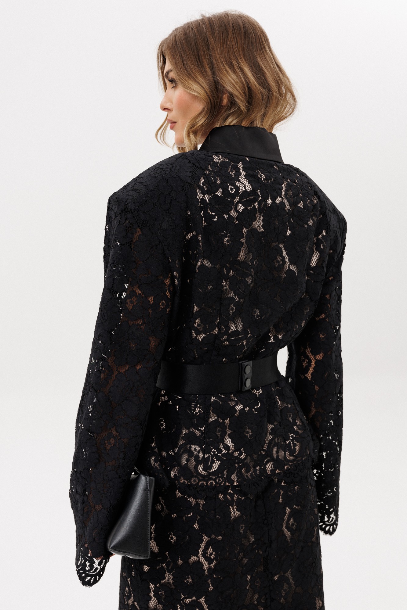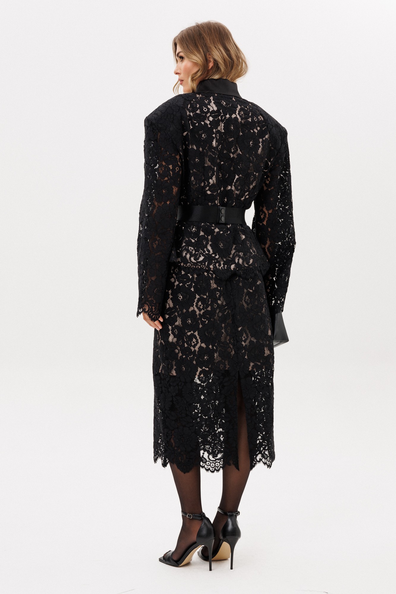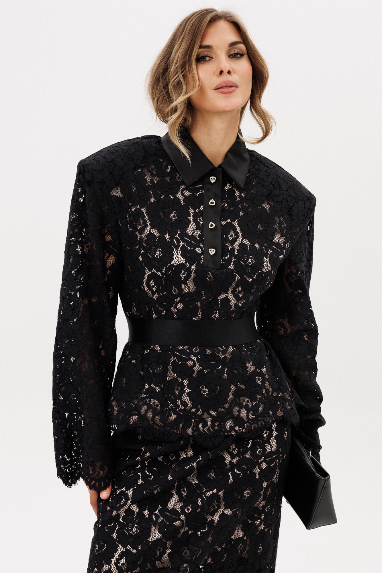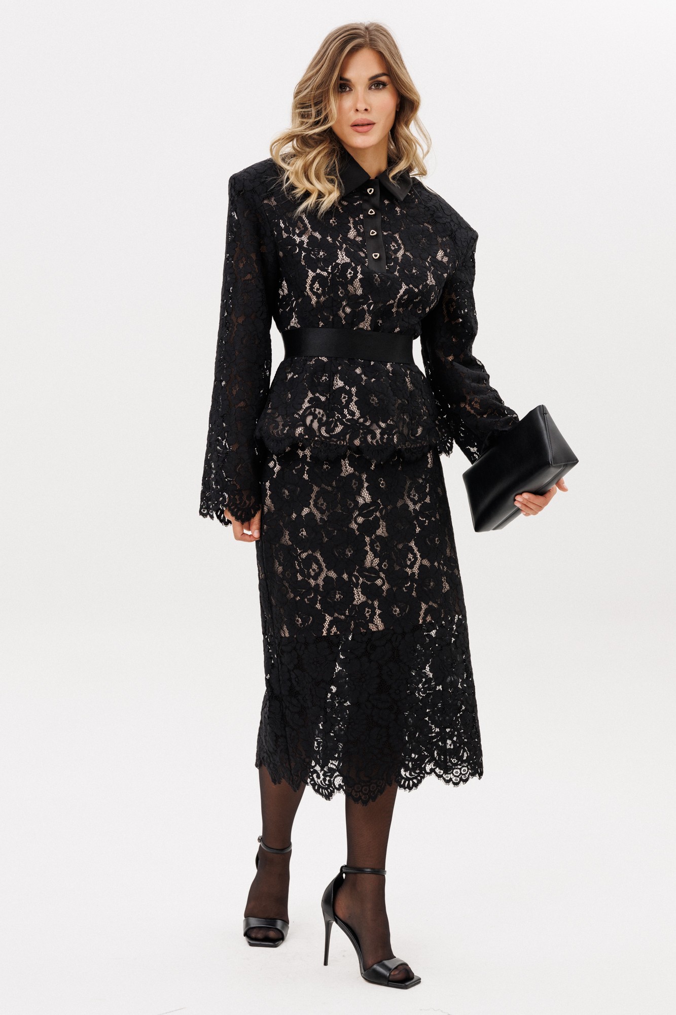 Комплект: блузка +юбка. Комплект выполнен из гипюра. Блузка прилегающего силуэта до линии бедер. Застежка спереди на пуговицы и на потайную молнию в боковом шве. Воротник стояче-отложной. Плечевой шов удлинен. Рукав втачной одношовный. По низу блузки и рукава фестоны. Блузка на отлетной по низу подкладке телесного цвета. Блузка с плечевыми накладками. Юбка прямого силуэта, длиной миди, на притачном поясе. Застежка на потайную молнию сзади в среднем шве. По низу юбки фестоны. Юбка на отлетной по низу подкладке. В комплект входит съемный пояс из широкой эластичной тесьмы, застегивающийся на две кнопки.
