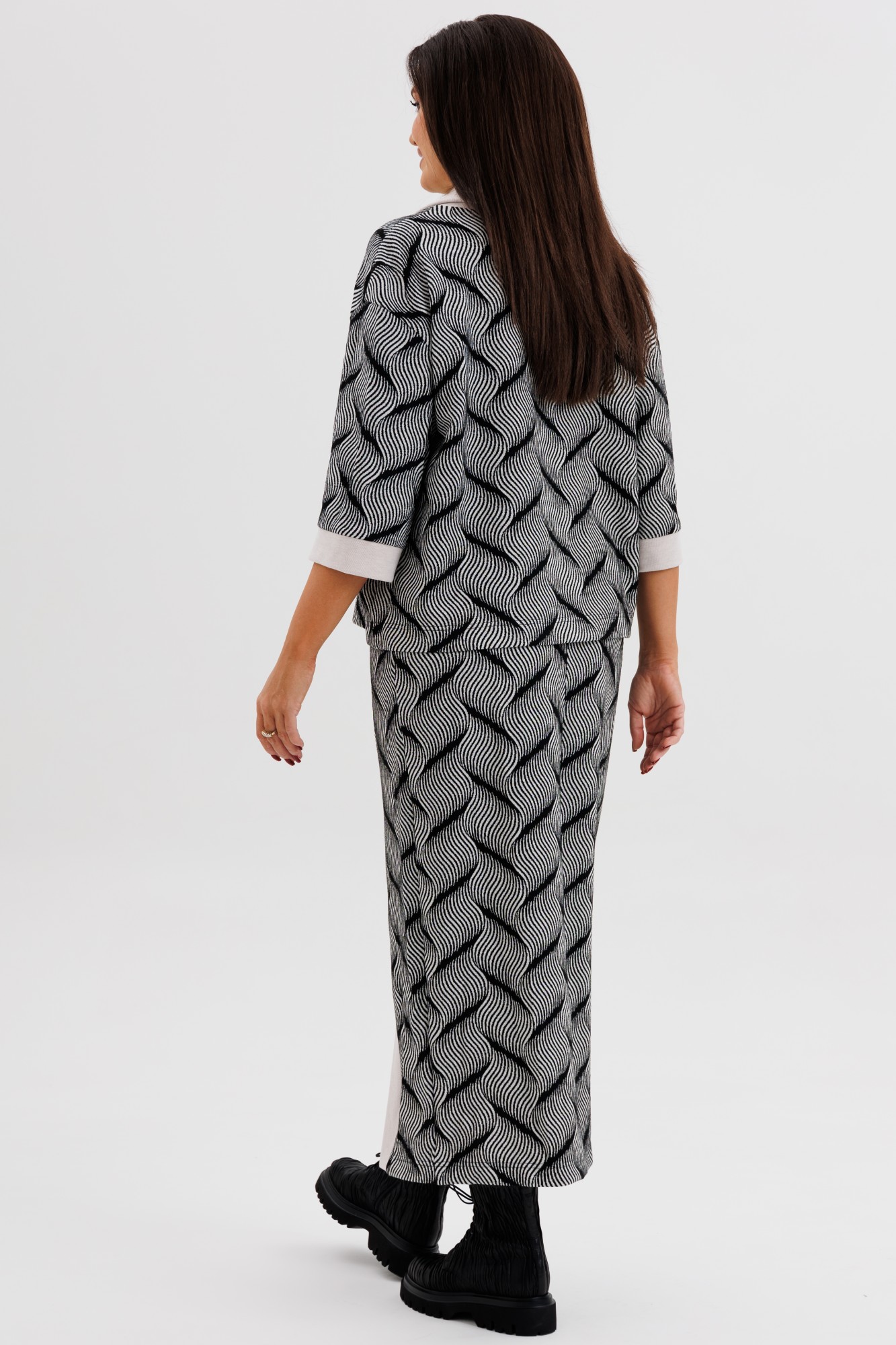Модный трикотажный костюм с юбкой станет отличным выбором для повседневных образов. В нём удобно и комфортно! Свободный упрямлённый джемпер с вырезом поло, воротником и отделкой из контрастного трикотажного полотна. Юбка прямая. с эффектной шлицей по левой стороне переда и отделкой из контрастного полотна. Пояс юбки на эластичной тесьме в области спинки, с застёжкой по центру заднего полотнища.