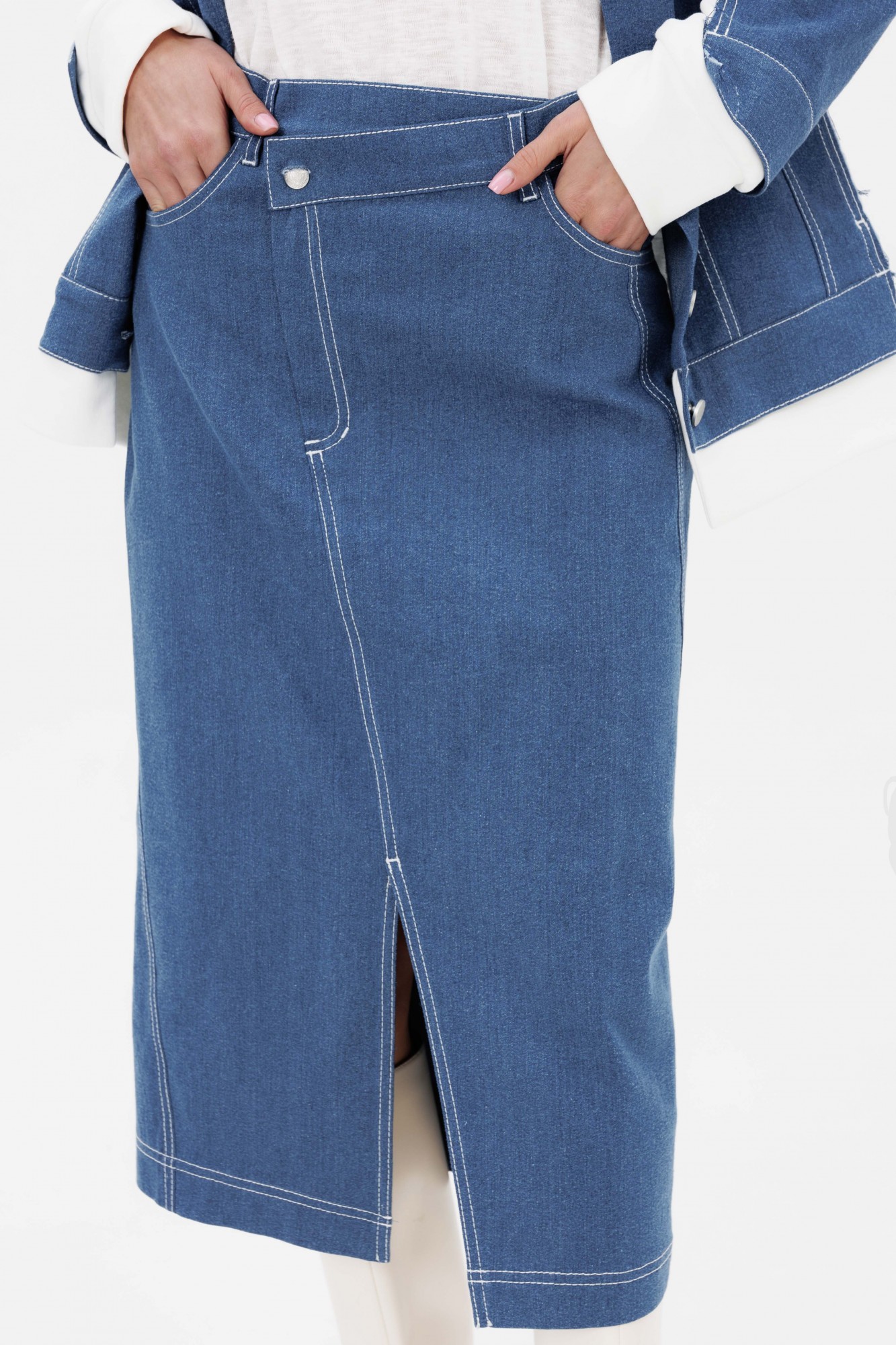 Удобство, практичность, неформальность и самодостаточность. Эти критерии, главным образом, учитывались при создании невероятного костюма в стиле спорт-кэжуал. Это по-настоящему стильное и смелое решение: соединить трикотажный футер и джинс-в итоге, идеальная одежда для прогулок, отдыха, встреч с друзьями. Удобная куртка свободного покроя с заниженной линией плеча, рубашечным рукавом, центральной застежкой и стояче-отложным воротником. Полочка с отрезной кокеткой, вертикальными рельефами, верхним карманом с клапаном и боковым карманом, притачным поясом. Спинка с отрезной кокеткой, боковыми рельефами и притачным поясом. Рукав на притачной манжете, со вставкой из джинсовой ткани. По линии плеча, боковой части и низу-вставки из контрастного трикотажного хлопкового полотна. Юбка-карандаш из денима, длины миди интересного перевернутого кроя. Все швы смещенные от центра, как бы закручивают изделие, придавая ему нехарактерный образ. Модель на притачном поясе со шлевками, боковыми фигурными карманами, задними накладными карманами. По центру переда-высокий разрез.