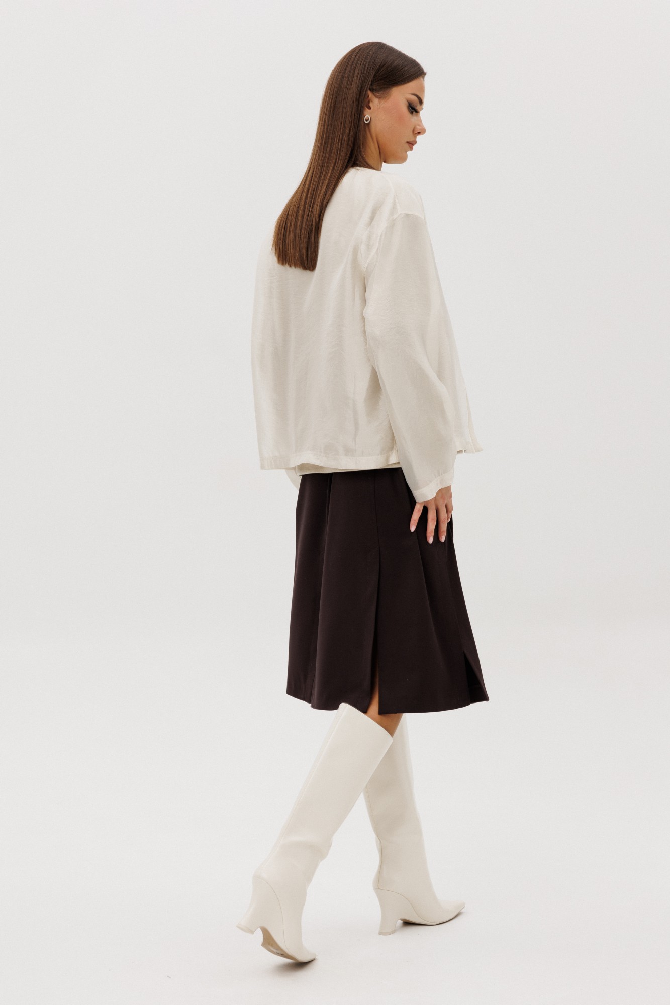 Финальный штрих — невероятно нежная блуза из тонкой вискозной органзы. Полупрозрачная, воздушная, она добавляет образу утончённый шарм и лёгкий эффект многослойности, который выглядит по-настоящему современно и статусно.