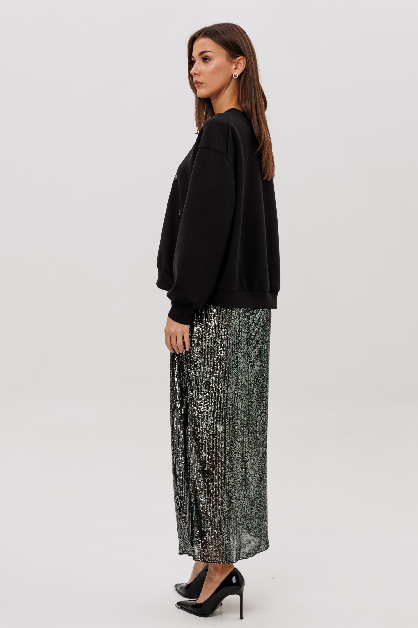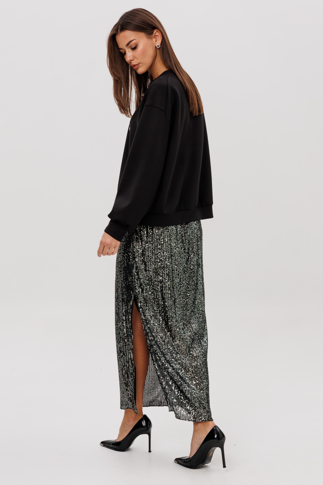 Стильный комплект, сочетающий уют и женственность. Мягкий свитшот из комфортного трикотажа украшен ручной расшивкой декоративными элементами в форме «клевера» — утончённая деталь, создающая акцент на естественной элегантности. Юбка выполнена из трендового полотна в пайетку. Юбка прямая, длинная на эластичном поясе и подкладке. Такой комплект — универсальное решение для повседневных образов и стильных выходов: достаточно сменить обувь и аксессуары, чтобы выглядеть по-новому.