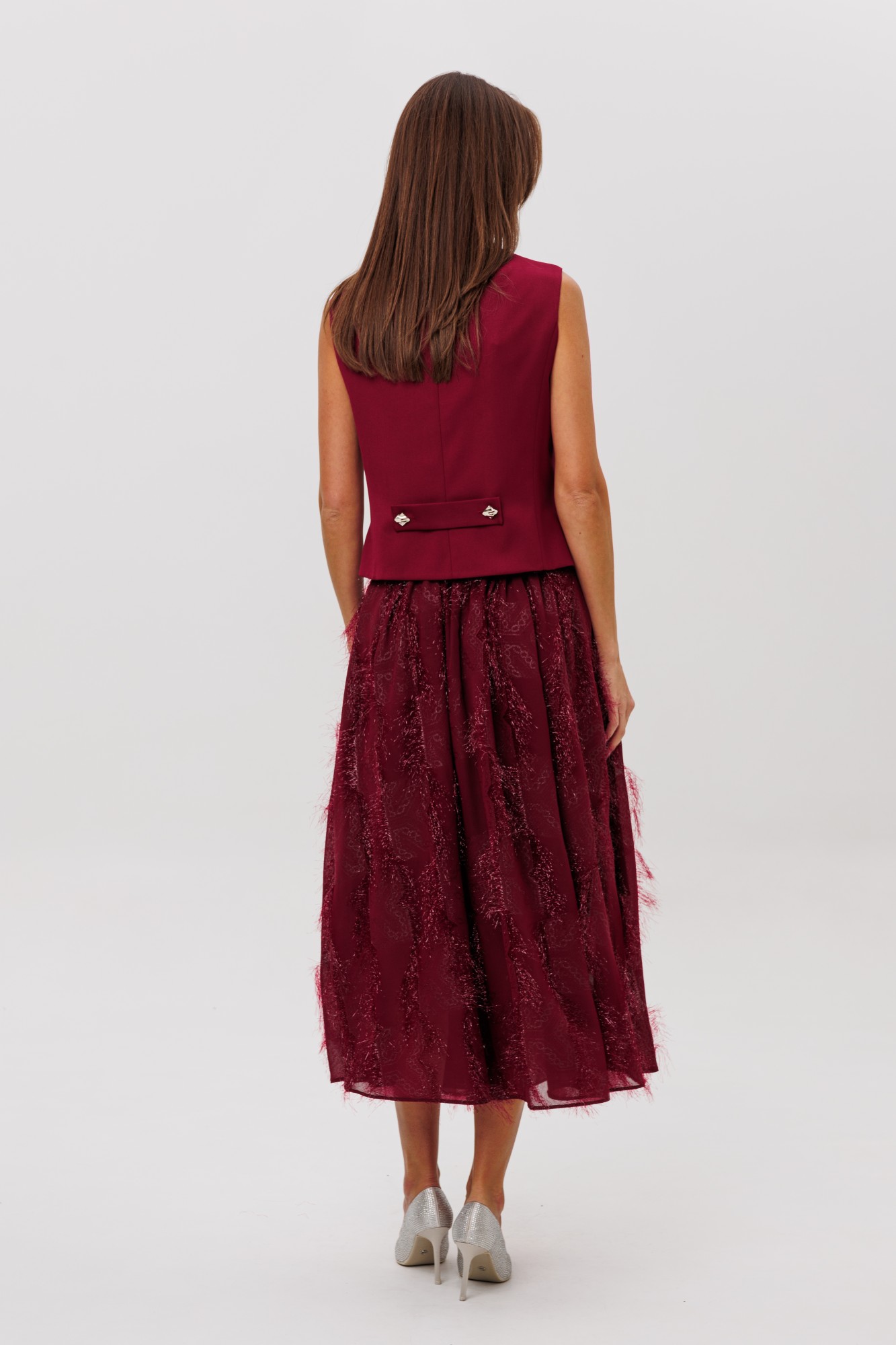 Актуальный комплект, в котором строгая геометрия жилета гармонично сочетается с романтичной женственностью многослойной юбки. Лёгкий шифон с фактурным переливом делает образ выразительным и праздничным, а продуманная посадка юбки обеспечивает красивую линию талии и динамику силуэта.