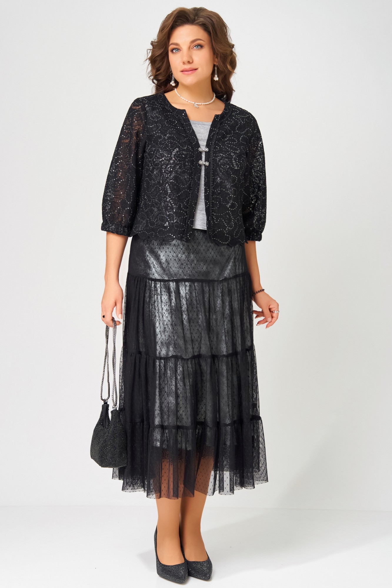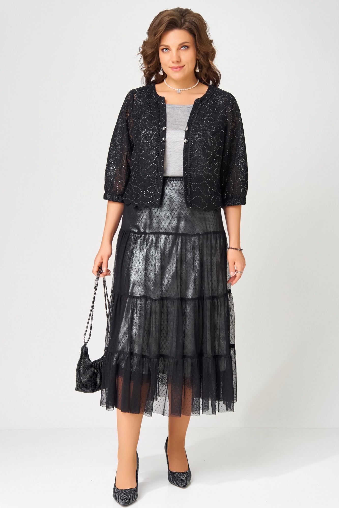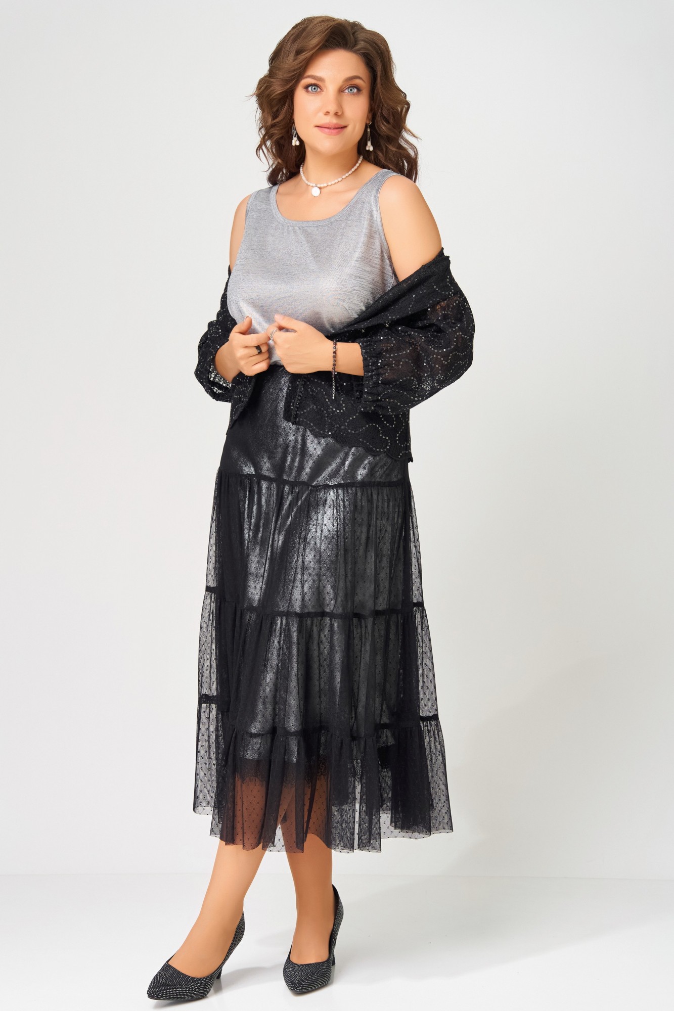 Нарядный комплект "Сафира" состоит из нарядного болеро с пайетками, сатиновой юбки с сеткой и трикотажной нарядной майки-топ. Болеро выполнено из кружевной ткани с вышитыми пайетками. Болеро прямого силуэта, по полочке нагрудная выточка, застежка. Болеро застегивается на две декоративные застежки. Горловина овальной формы, край борта обтачен подбортом-обтачкой. По краю болеро настрочена декоративная тесьма. Рукава одношовные втачные, по низу рукава вставлена серебристая резинка. Юбка с воланами выполнена из двух видов ткани: серебристого сатина и сетки. Нижняя юбка выкроена по косой, по низу юбки пришито кружево. Воланы присобраны на сборку и стачены между собой на пятинитку. Верх юбки обработан швом в подгибку с открытым срезом, туда же вставлена резинка. Майка-топ выполнена из трикотажной ткани с легким серебристым блеском. Проймы и горловина обработаны окантовкой. Низ майки подшит на распошивалку."Сафира" — ваш идеальный образ для торжеств. Лёгкое болеро, изящная юбка и лаконичный топ создают гармоничный ансамбль, в котором комфорт сочетается с элегантностью. Комплект подойдёт для любого праздника — от уютного семейного вечера до эффектного выхода.