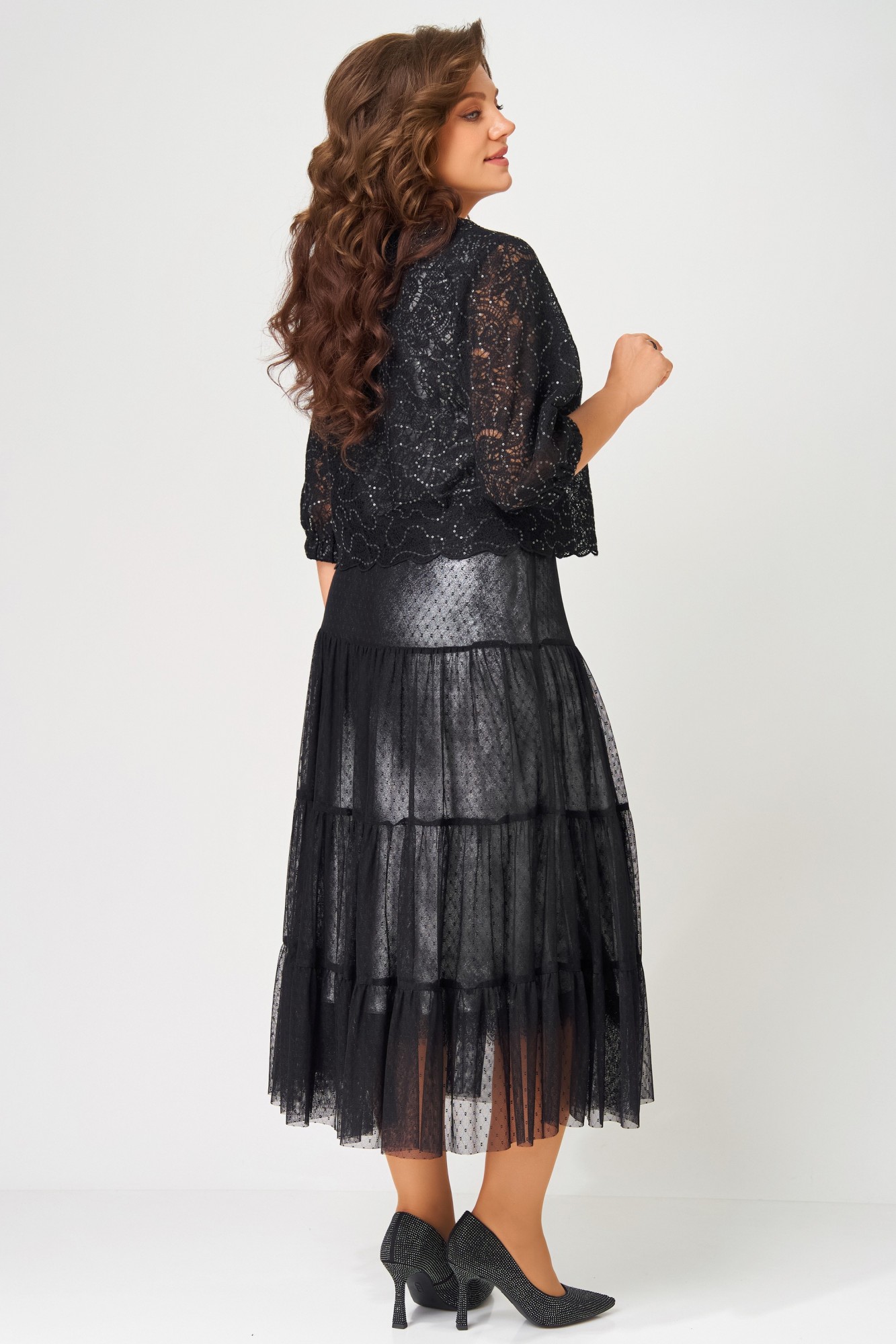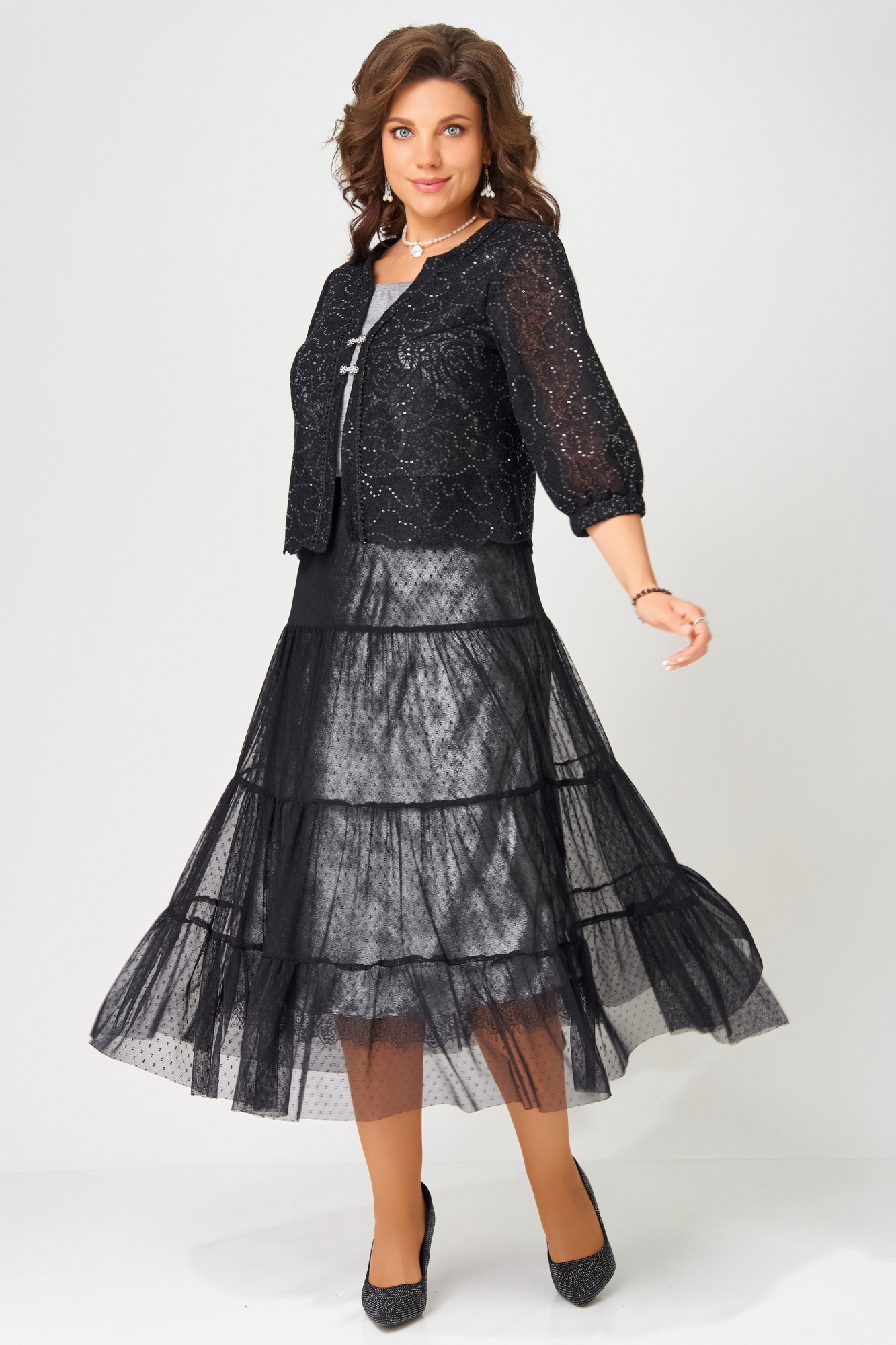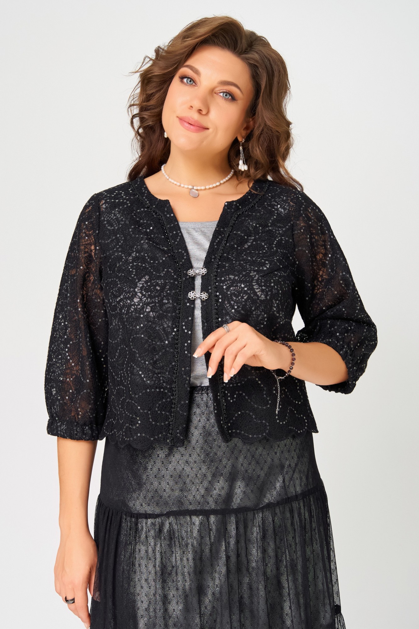 Нарядный комплект "Сафира" состоит из нарядного болеро с пайетками, сатиновой юбки с сеткой и трикотажной нарядной майки-топ. Болеро выполнено из кружевной ткани с вышитыми пайетками. Болеро прямого силуэта, по полочке нагрудная выточка, застежка. Болеро застегивается на две декоративные застежки. Горловина овальной формы, край борта обтачен подбортом-обтачкой. По краю болеро настрочена декоративная тесьма. Рукава одношовные втачные, по низу рукава вставлена серебристая резинка. Юбка с воланами выполнена из двух видов ткани: серебристого сатина и сетки. Нижняя юбка выкроена по косой, по низу юбки пришито кружево. Воланы присобраны на сборку и стачены между собой на пятинитку. Верх юбки обработан швом в подгибку с открытым срезом, туда же вставлена резинка. Майка-топ выполнена из трикотажной ткани с легким серебристым блеском. Проймы и горловина обработаны окантовкой. Низ майки подшит на распошивалку."Сафира" — ваш идеальный образ для торжеств. Лёгкое болеро, изящная юбка и лаконичный топ создают гармоничный ансамбль, в котором комфорт сочетается с элегантностью. Комплект подойдёт для любого праздника — от уютного семейного вечера до эффектного выхода.