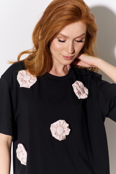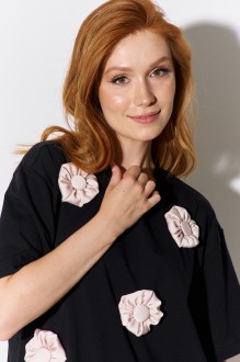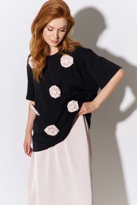 Комплект майка с юбкой. Майка свободного силуэта со спущенным рукавом. Характеристики: выполнена из трикотажного полотна в черном цвете, по переду декоративные объемные цветы, по горловине обработана планка, рукав укороченный. Длина майки по переду 67 см, длина рукава 21 см. Юбка А-силуэта. Характеристики: выполнена из шелковой ткани в бежевом цвете, верх юбки обработан эластичной тесьмой. Длина юбки: 93 см.