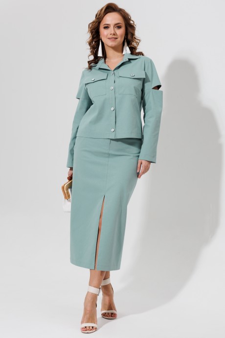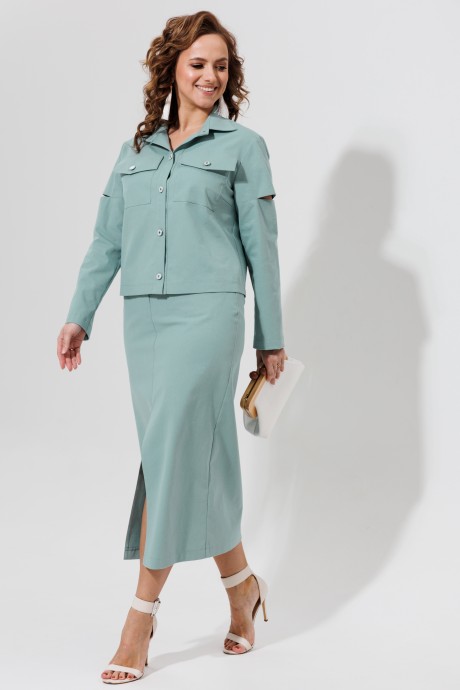 Костюм женский жакет и юбка. Изготовлен из текстильной ткани с небольшим содержанием стрейча. Впереди обработана планка застёгивающаяся на четыре пуговицы, два накладных кармана с клапаном и нагрудная вытачка идущая от бокового шва. По спинке обработана кокетка. Воротник стояче-отложной на стойке. Рукава одношовные с прорезями у линии обхвата плеча. По кокетке, карманам, клапанам, планке, воротнику, рукавам, идут отделочные строчки в тон ткани. Юбка прямая с карманами на поясе, спереди застёгивается на молнию. По среднему шву расположен разрез. В большой базе юбка с поясом на резинке. Жакет удлинён на 3 см.