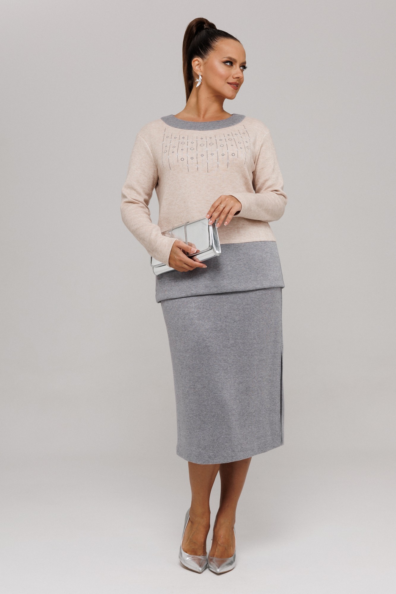 Стильный женский трикотажный костюм с юбкой станет настоящей находкой для каждой современной модницы. Джемпер данного комплекта прямого силуэта со спущенными рукавом, с планкой по горловине и подрезом ниже линия талии, выполненным из отделочной ткани. Декором данного джемпера служит дизайнерская вышивка. Приталенный силуэт трикотажной юбки с высокой посадкой и разрезом сбоку делает образ лаконичным, поможет всегда оставаться в тренде. Юбка на трикотажной подкладке.