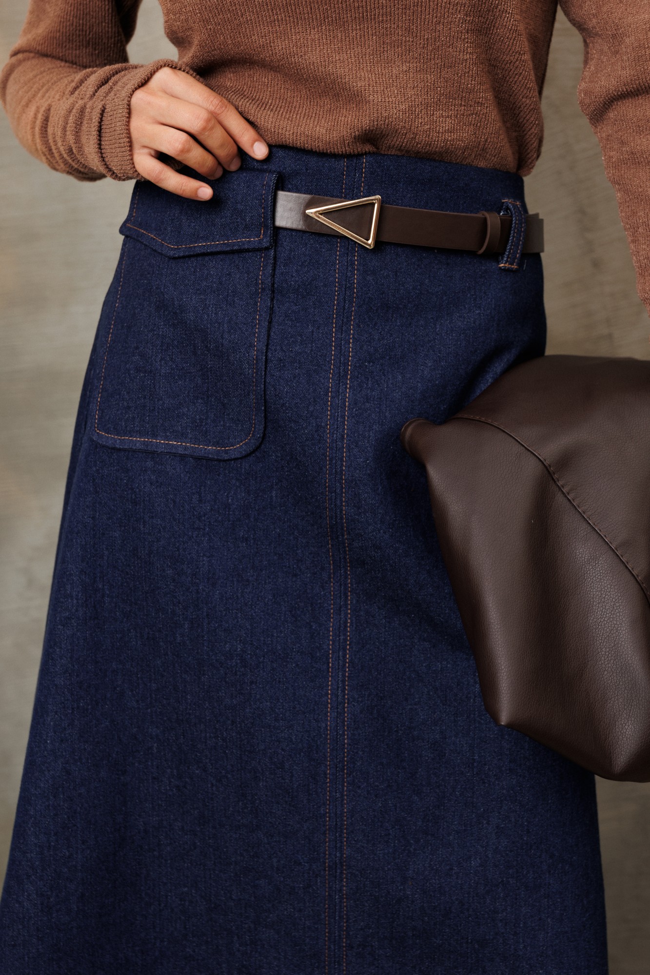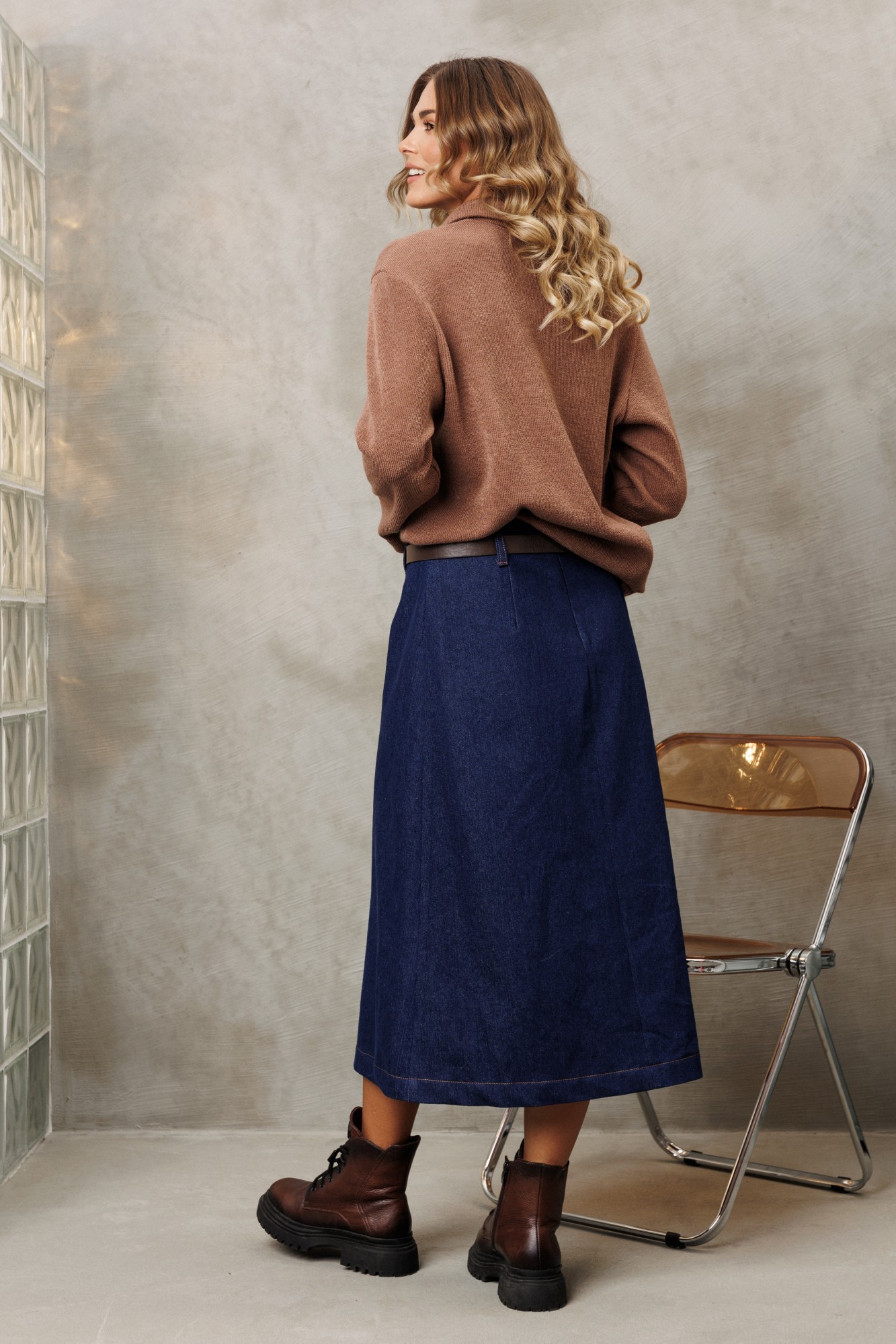 Костюм состоит из джемпера и юбки. Джемпер прямого силуэта с воротником поло из теплого трикотажного полотна. Рукав втачной одношовный. Юбка А-образного силуэта из плотного джинса. Передняя часть юбки со средним швом. С правой стороны вверху настрочен карман с клапаном- шлевкой. Задняя часть юбки со средним швом и вытачками. Сверху в среднем шве обработана потайная молния. Вдоль линии пояса настрочены шлевки. Пояс цельнокроеный на обтачке. Юбка на подкладке. Вдоль среднего шва по переду и по периметру кармана проложена декоративная строчка. К юбке прилагается съёмный ремень. Фурнитура может быть изменена с охранением художественного замысла.