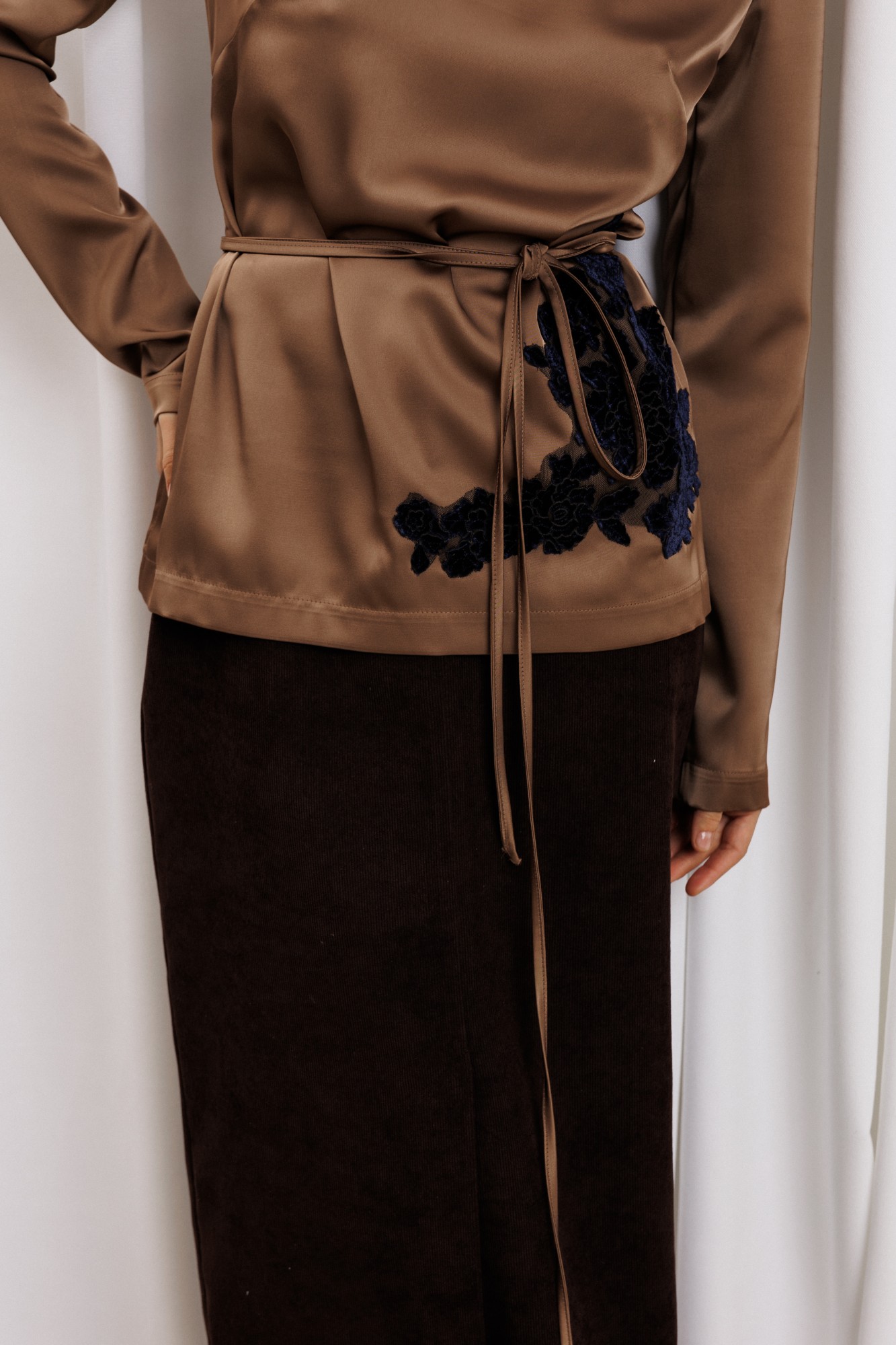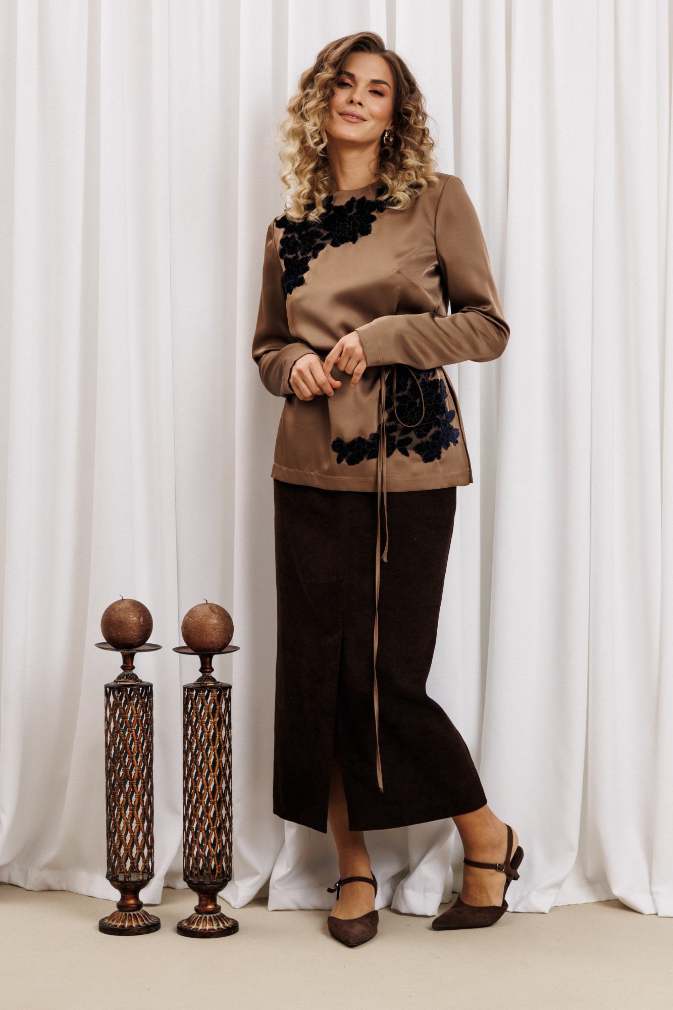 Костюм состоит из блузки и юбки. Блузка прямого силуэта выполнена из атласной ткани. Перед с нагрудной вытачкой. Спинка со средним швом и застежкой "капелькой" на петлю и пуговицу сверху. Рукав втачной одношовный. В боковых швах разрезы. По переду настрочена аппликация из велюровых цветов на сетке. К блузке прилагается пояс из основной ткани. Юбка прямого силуэта выполненная из мягкой вельветовой ткани. Передняя честь юбки с вытачками, со средним швом и застежкой гульфиком на молнии и шпицей спереди. Задняя часть юбки с вытачками. Юбка на притачном поясе с застежкой на петлю и пуговицу спереди и резинками по бокам. Юбка на подкладке.