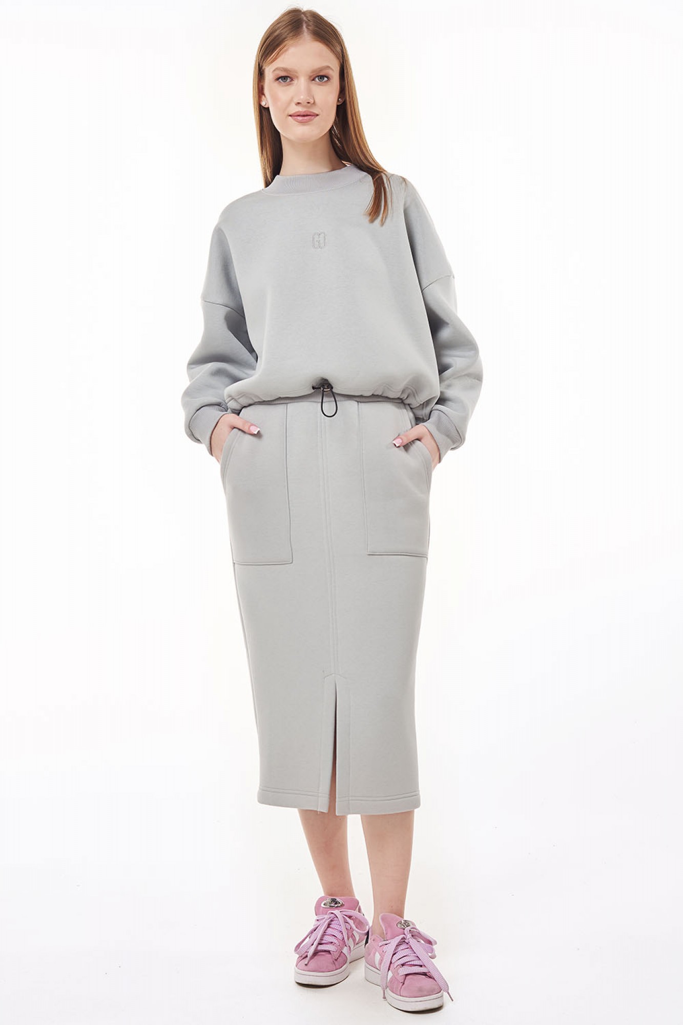 Современный комфортный костюм, состоит из зауженной юбки и укороченного свитшота. Отлично подойдёт для офиса, прогулок и путешествий. Пошит из теплой, комфортной ткани. Свитшот покроя оверсайз со спущенной линией плеча. Горловина, манжеты рукавов выполнены из ткани-компаньона кашкорсе. По центру переда вышивка-логотип в цвет ткани. Свитшот с кулисой по низу с резинкой внутри и фиксатором по центру переда. Юбка зауженная к низу, облегающая фигуру, длиной миди. Перед с удобными боковыми карманами, по центру переда разрез с отделочной строчкой. Пояс из ткани кашкорсе с резинкой внутри.