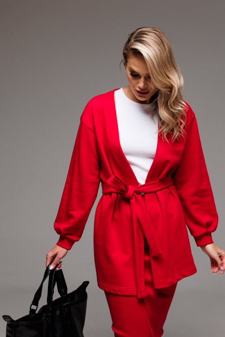Костюм Gowear из футера в стиле smart casual поможет создать в меру строгий и одновременно расслабленный образ. Костюм состоит из жакета и юбки из эластичной ткани кошкорсе. Жакет прямого силуэт, с v-образным вырезом горловины, без застежки, с отдельным поясом. На левом переде вышивка-логотип в цвет ткани. Рукав свободный, со складками, присобран на манжету. Жакет без подкладки. Юбка прямая, облегающая фигуру с разрезом на спинке. Пояс цельнокроенный с резинкой внутри.