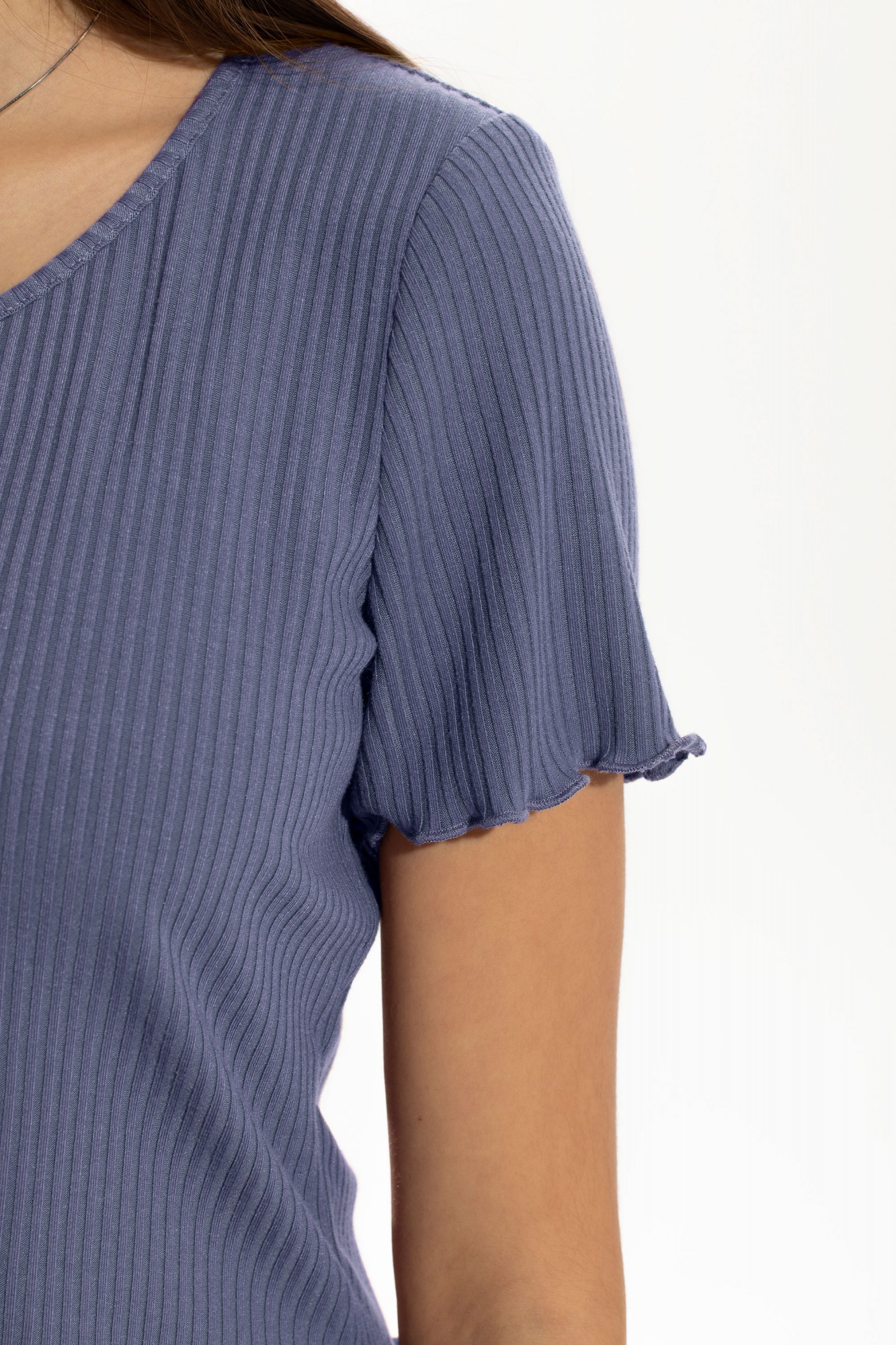Блузка без воротника, с круглым вырезом горловины, без застежки. По переду со средним швом, рюшей, выходящей из среднего шва переда. Спинка цельная. Рукав втачной, короткий. Горловина окантована. Юбка прямая, без пояса, верхний срез на резинке. Переднее полотнище со средним швом, заканчивающимся разрезом и рюшей, выходящей из среднего шва.