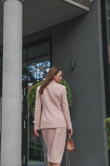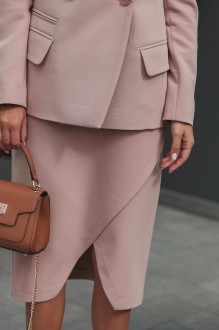Стильный костюм состоящий из жакета и юбки. Жакет на подкладке прямого силуэта с двубортной застежкой на петли и пуговицы, рельефными швами и вытачками. Воротник с лацканами. По бокам обработаны карманы в рамку с клапаном, над правым декоративный карман в рамку, в верхней левой части карман с листочкой. Юбка на подкладке заужена к низу, перед юбки на запах, фиксируемый в боковом шве, застежка по среднему шву заднего полотнища на тесьму молнию и пуговицу.
