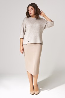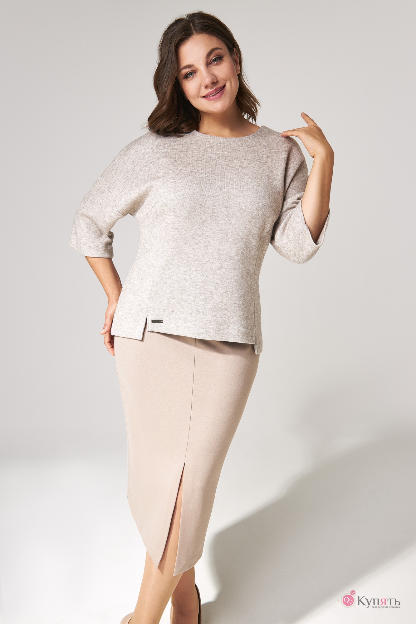 Комплект 2-х предметный трикотажный, состоящий из джемпера и юбки. Джемпер полуприлегающего силуэта со спущенными рукавами, с круглым вырезом горловины, по спинке декоративная молния. Трикотажная юбка на подкладке с разрезом по переду, застегивается на молнию и пуговицу сбоку.