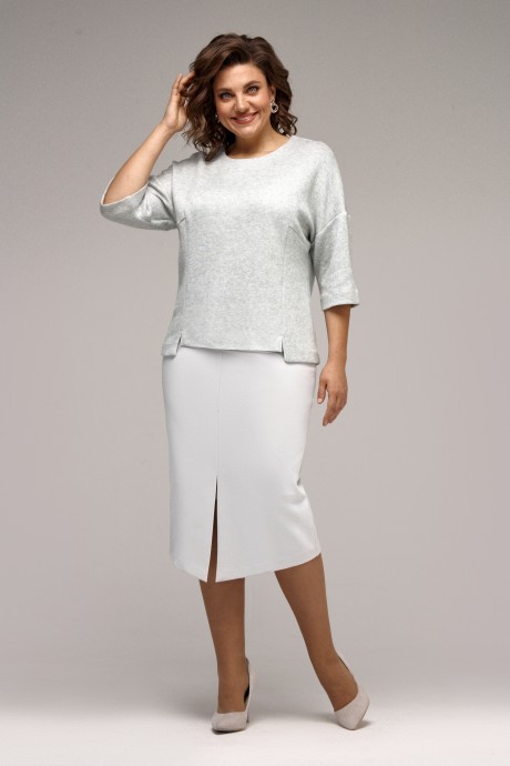 Комплект 2-х предметный трикотажный, состоящий из джемпера и юбки. Джемпер полуприлегающего силуэта со спущенными рукавами, с круглым вырезом горловины, по спинке декоративная молния. Трикотажная юбка на подкладке с разрезом по переду, застегивается на молнию и пуговицу сбоку.