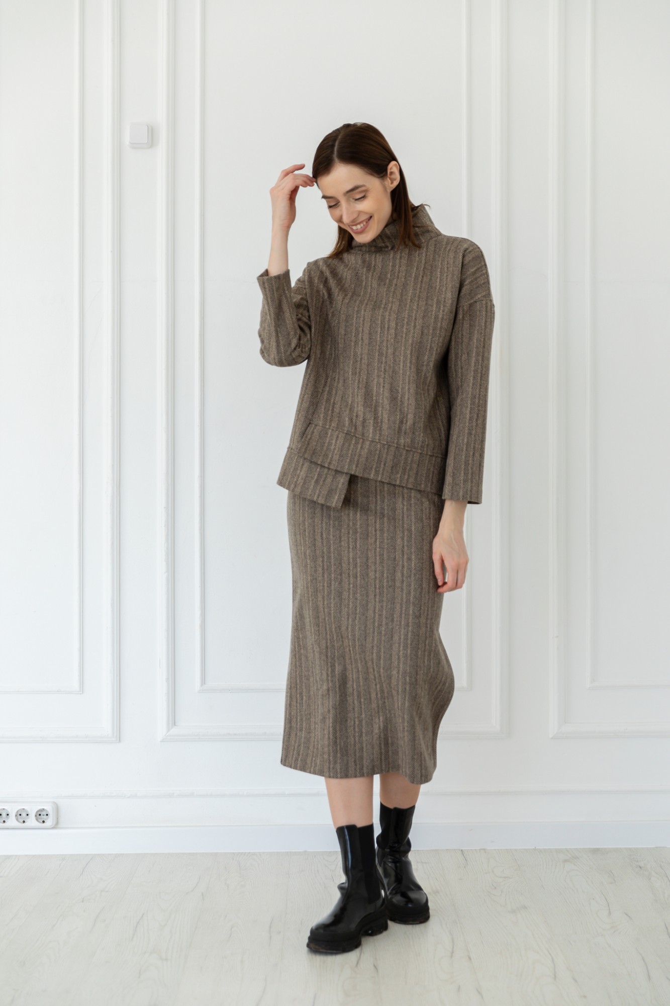 Модный современный женский костюм идеально подойдет для прохладной погоды. Стильный джемпер с интересной ассиметрией и прямая юбка длиной ниже колена подчеркнут индивидуальность каждой девушки, а боковой разрез подарит свободу движений.