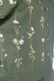 Костюм женский 2х-предметный, состоит из блузки и юбки, выполнен из натуральной ткани белорусского производства. Блузка свободного силуэта с воротником рубашечного типа и центральной застежкой на петли с пуговицами. Низ переда обработан притачной планкой. На спинке кокетка и складки. Рукава спущенные с отложными манжетами. Блузка декорирована вышивкой. Юбка прямого силуэта с притачным поясом, частично на эластичной тесьме. По переду обработаны боковые карманы, в центральном шве переда имеется шлица. Юбка на подкладке.