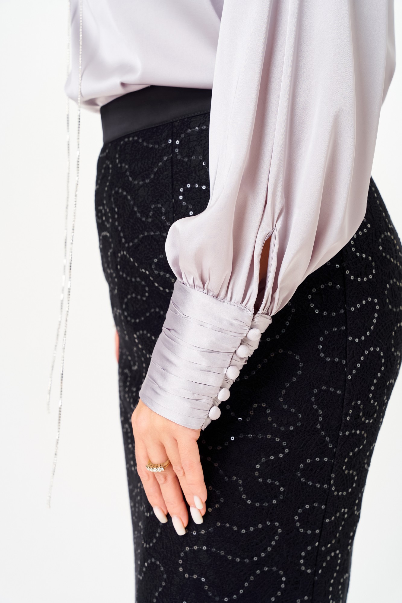 Блуза выполнена из мягкого блузочного сатина светло-серого цвета. Покрой свободный, линия плеча спущена. Горловина овальная, с одной стороны в плечевом шве заложены 2 складки. Рукав свободный широкий. Манжет рукава декорирован складками, застёжка на навесные петли и пуговицы в цвет основной ткани. Спинка блузки прямая свободная без особенностей, застёжка капелька на нависную петельку и пуговицу.