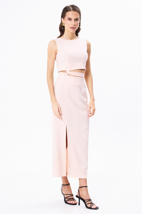 Комплект, состоящий из двух изделий, которые соединяются вручную с помощью завязок. Лиф приталенный с потайной молнией в боковом шве. Юбка длины миди слегка разведена книзу трапецией. В рельефе по переду разрез. В боковом шве потайная молния.
