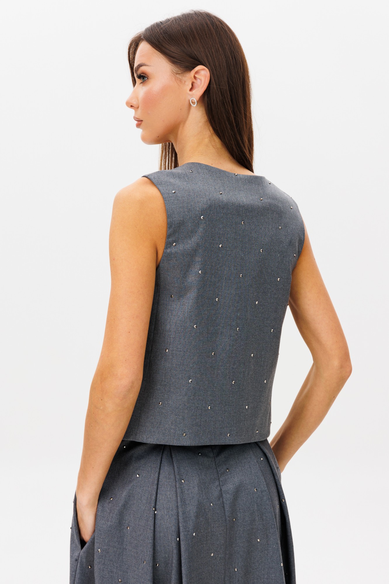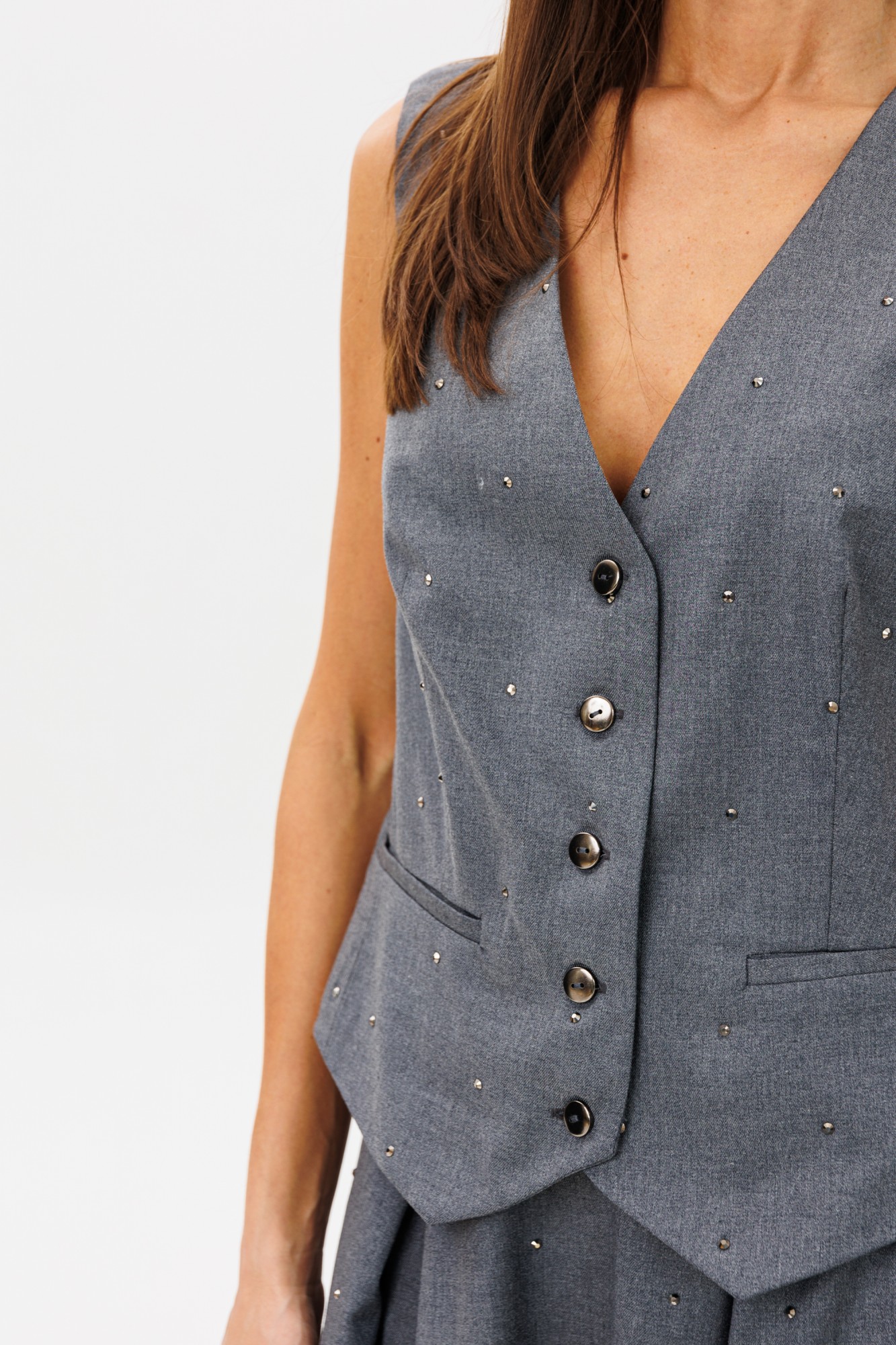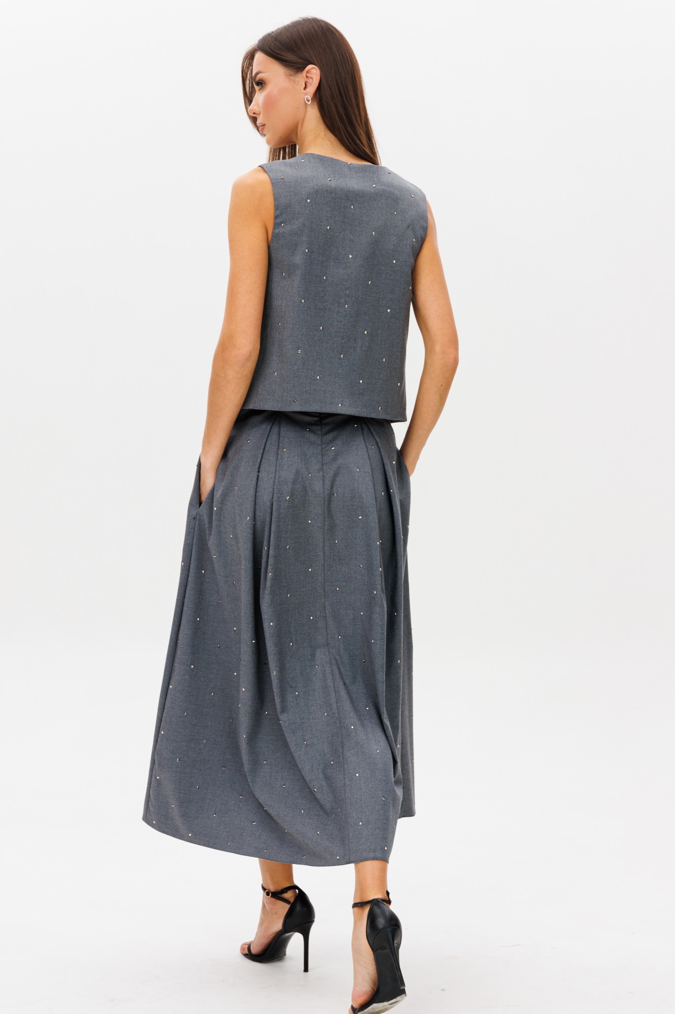 Этот эксклюзивный костюм, состоящий из классического жилета с пятью пуговицами и прорезными карманами и удлиненной юбки-трапеции из костюмной ткани, декорированной стразами с боковыми карманами и изящными встречными складками, — идеальное сочетание элегантности и практичности. Жилет, украшенный пуговицами, добавляет нотку аристократической изысканности, а карманы делают его не только стильным, но и удобным. Юбка-трапеция создает утонченный и женственный образ, в то время как карманы и складки добавляют элемент загадочности и шарма. Этот костюм — воплощение времени и моды, которое будет привлекать восхищенные взгляды и вызывать восхищение своим утонченным стилем и вниманием к деталям.