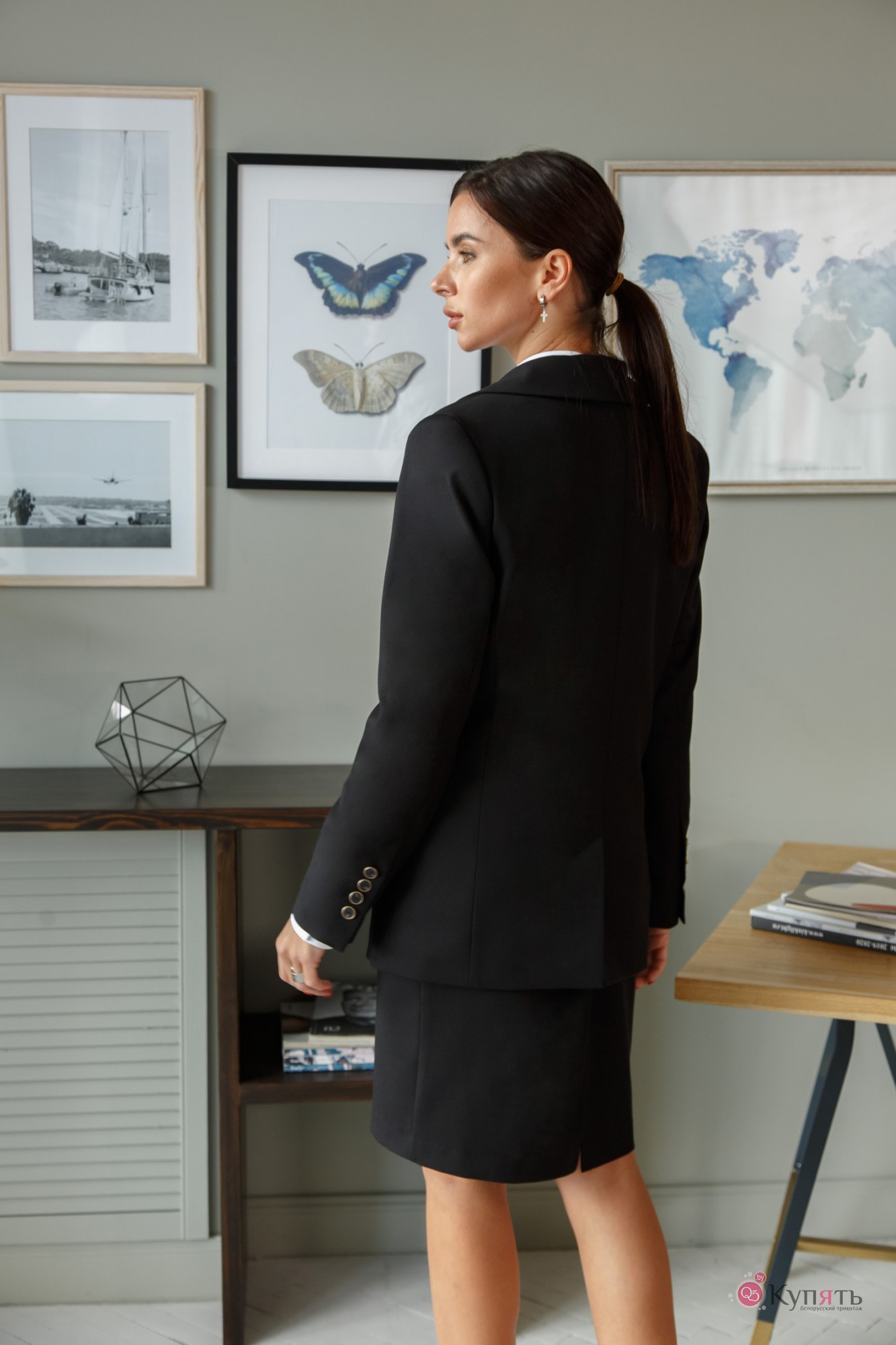 Костюм женский делового стиля, состоящий из жакета и юбки. Жакет на подкладке, с двубортной застёжкой по линии талии. На правой полочке два прорезных кармана с клапанами, на левой - декоративный клапан. Воротник пиджачный. Рукав втачной двух шовный, со шлицей по низу, застегивающейся на 4 пуговицы. Спинка со средним швом и шлицей.