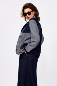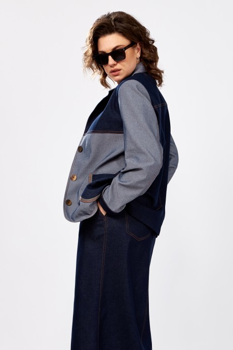 Уникальный дизайнерский юбочный костюм из хлопкового джинса. Жакет комбинированный, классического кроя, свободного силуэта без подкладки. Рукав втачной двухшовный с притачной манжетой, по полочке кокетка и накладные карманы. Застежка на петли пуговицы. Юбка длины макси, с застежкой и разрезом по переду, в боковых швах прорезные карманы, сзади накладные. Пояс на обтачке, без подкладки.