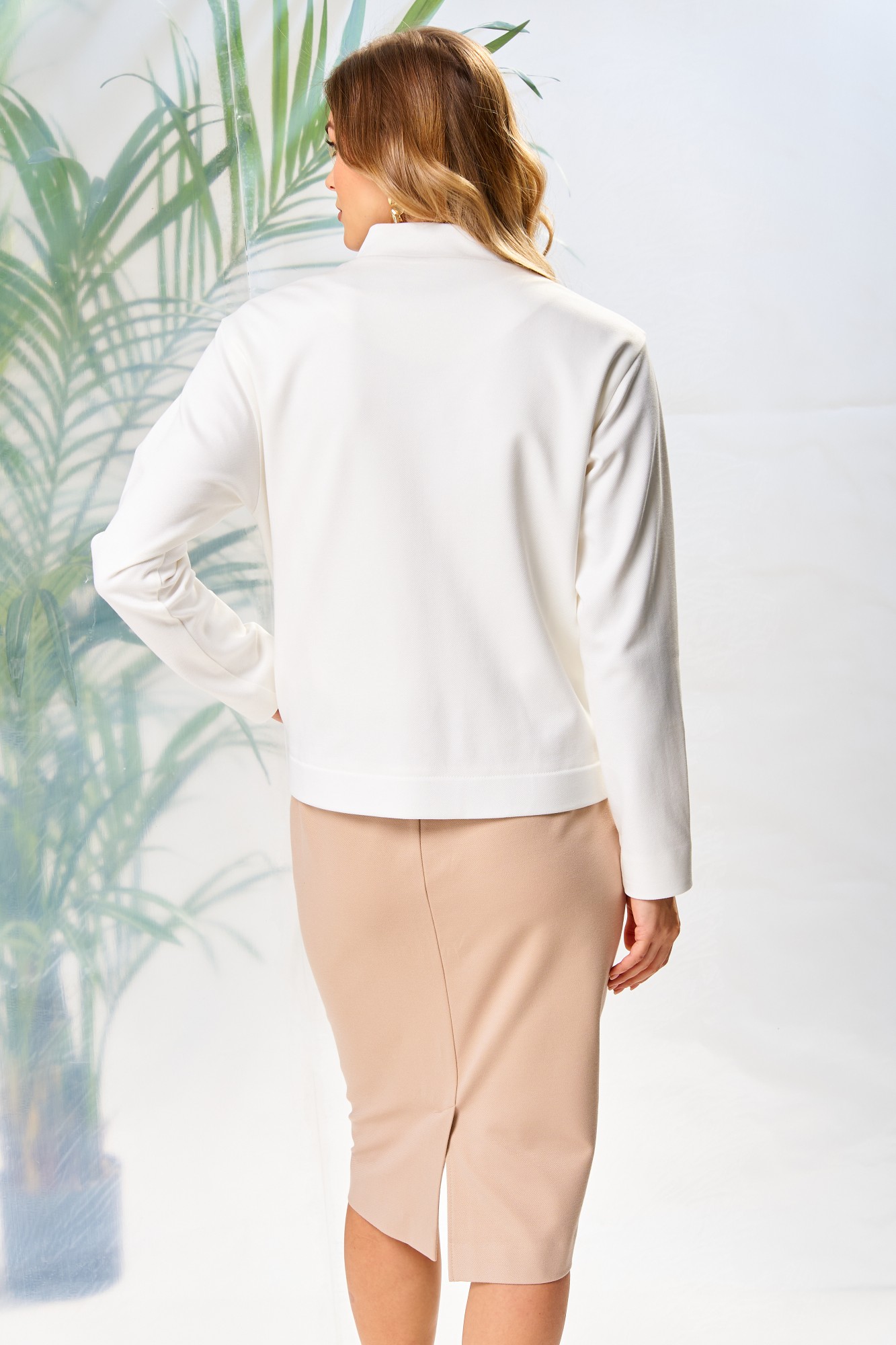 Джемпер женский, из трикотажного полотна, свободного силуэта, длиной до линии бедер, с втачными рукавами, с втачной бейкой по горловине, с центральной сквозной застежкой на 6 петель и 6 пуговиц. Детали переда жакета с вытачками, с накладными карманами, понизу втачная деталь с эластичной тесьмой. По низу детали спинки жакета вставлена эластичная тесьма. Рукава втачные одношовные. Вырез горловины «под горло», с втачной бейкой. Блузка женская, полуприлегающего силуэта, длиной ниже линии бедер, без рукавов, с разрезами в боковых швах. Деталь переда блузки с нагрудными вытачками. Вырез горловины блузки округлой формы. Юбка женская, из трикотажного полотна, на талии, плотно облегающая вверху и прямая к низу, длиной до коленей, с притачным поясом, в который вставлена эластичная тесьма. Заднее полотнище юбки со средним швом, который заканчивается шлицей. Декор может отличаться от представленного на фотографии.