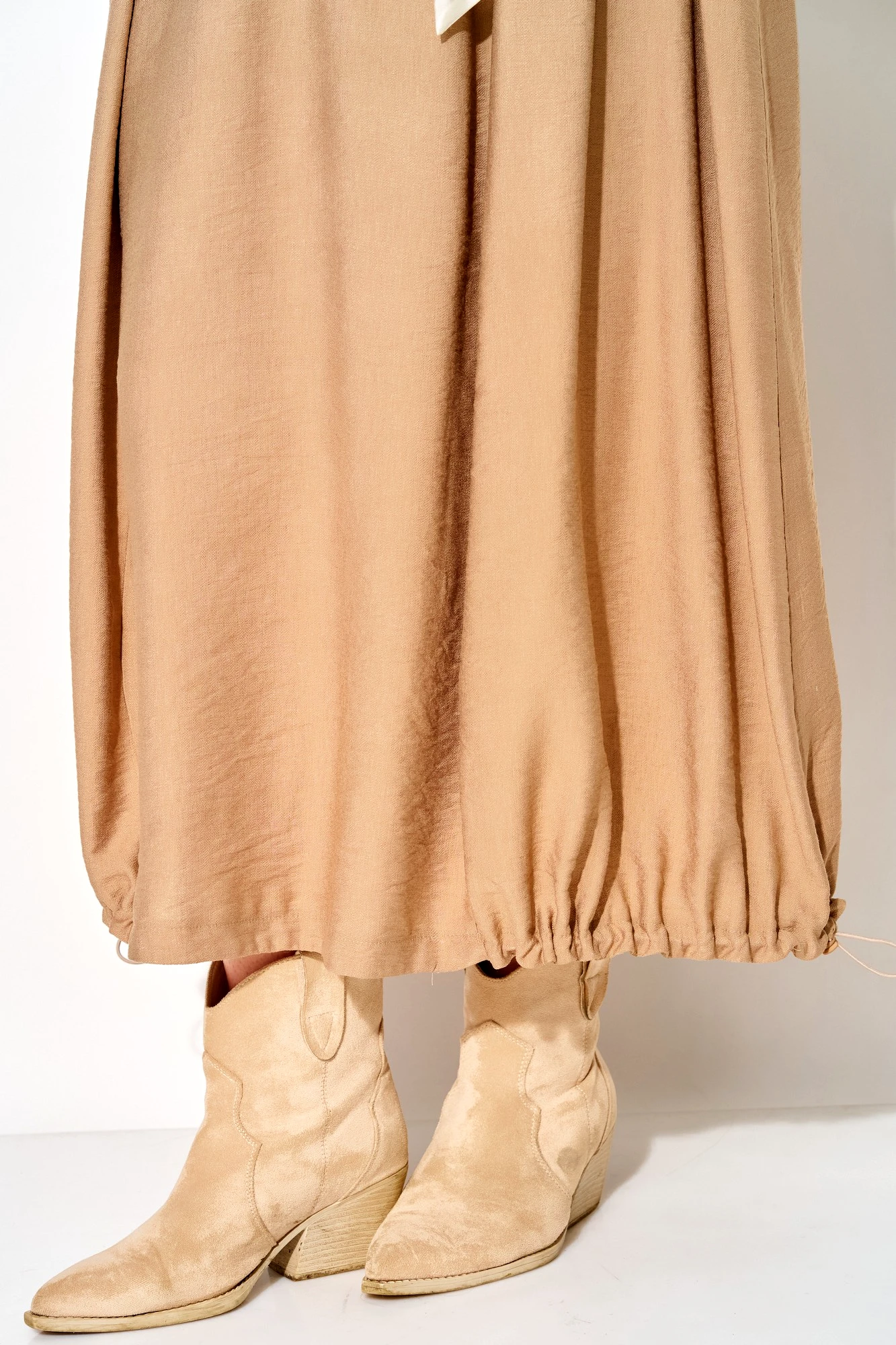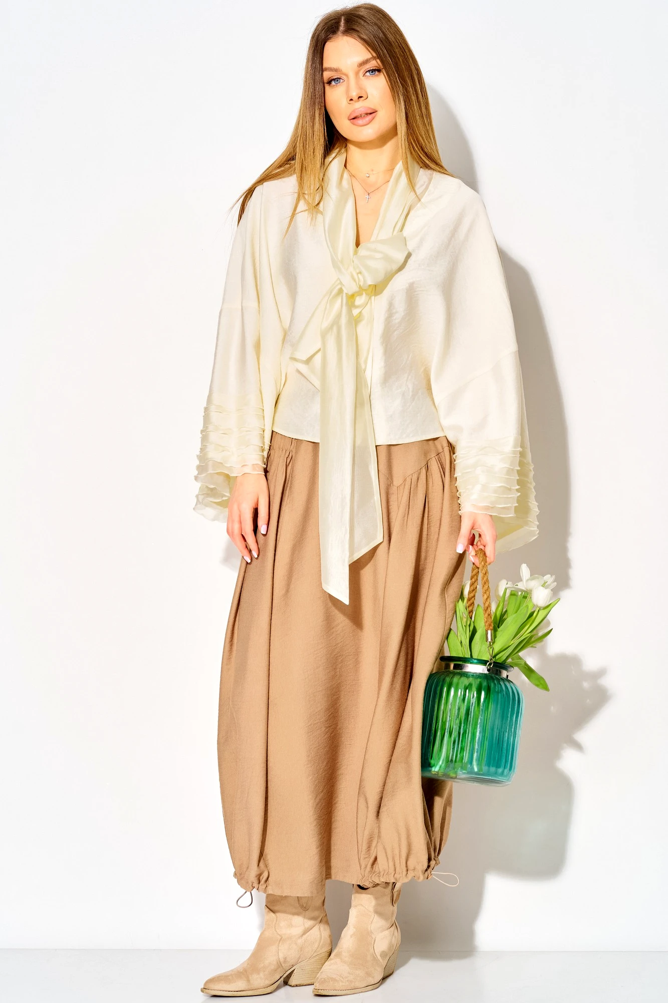 Изысканный комплект от LAIKONY в стиле бохо, состоящий из блузы и юбки. Блуза свободного силуэта длиной чуть выше линии бедер очаровывает своей легкостью и элегантностью. линия плеча спущена. Вырез горловины V-образный с элегантным шалевым воротником. Втачные рукава с изящными воланами, застежка центральная на три пуговицы. Юбка длиной в пол создана для тех, кто ценит комфорт и стиль. Силуэт свободный, плавно расширяющийся к низу. Притачной пояс с эластичной тесьмой обеспечивает идеальную посадку на талии. Рельефные швы и кокетки на переднем полотнище придают юбке структуру и оригинальность, на правой кокетке эластичная тесьма. Низ юбки оформлен фиксирующими элементами. Комплект выполнена из вискозы с крэш-эффектом. Ткань средней плотности, не тянется. Этот комплект — идеальный выбор для современных женщин, которые хотят выглядеть стильно и чувствовать себя комфортно в любой обстановке. Позвольте себе роскошь быть неповторимой!