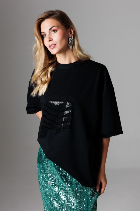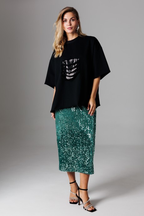 Актуальный комплект: блузон-майка стиля oversize с фронтальной вставкой из пайеточного полотна и юбки-карандаш из ворсового трикотажного полотна с пайетками. Блузон свободного силуэта со спущенной проймой и укороченным втачным рукавом длиной 26 см. По центру изделия расположен декоративный элемент прямоугольной формы: с изнаночной стороны настрочен прямоугольник из полотна с пайетками. С лицевой стороны произведены горизонтальные прорези, через которые просматривается полотно с пайетками. Горловина округлой формы на притачной планке высотой 3 см. Длина изделия по спинке 67 см. Юбка-карандаш из мягкого трикотажного полотна велюр с пайетками, на подкладке, чуть зауженная к низу. В среднем шве расположены потайная молния и открытый разрез. На линии талии расположены классические вытачки, пояс внутренний, обтачной. Длина изделия по среднему 82 см. Представленная фурнитура может отличаться от представленной на фото/видео материале. Особые рекомендации: рекомендуется холодная деликатная ручная стирка, без использования отбеливающих СМС, без интенсивного трения. Сушка в вертикальном положении. ВТО с минимальным паром.