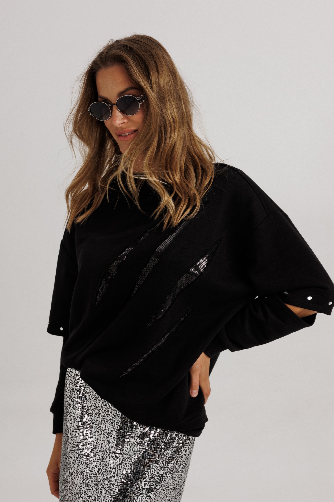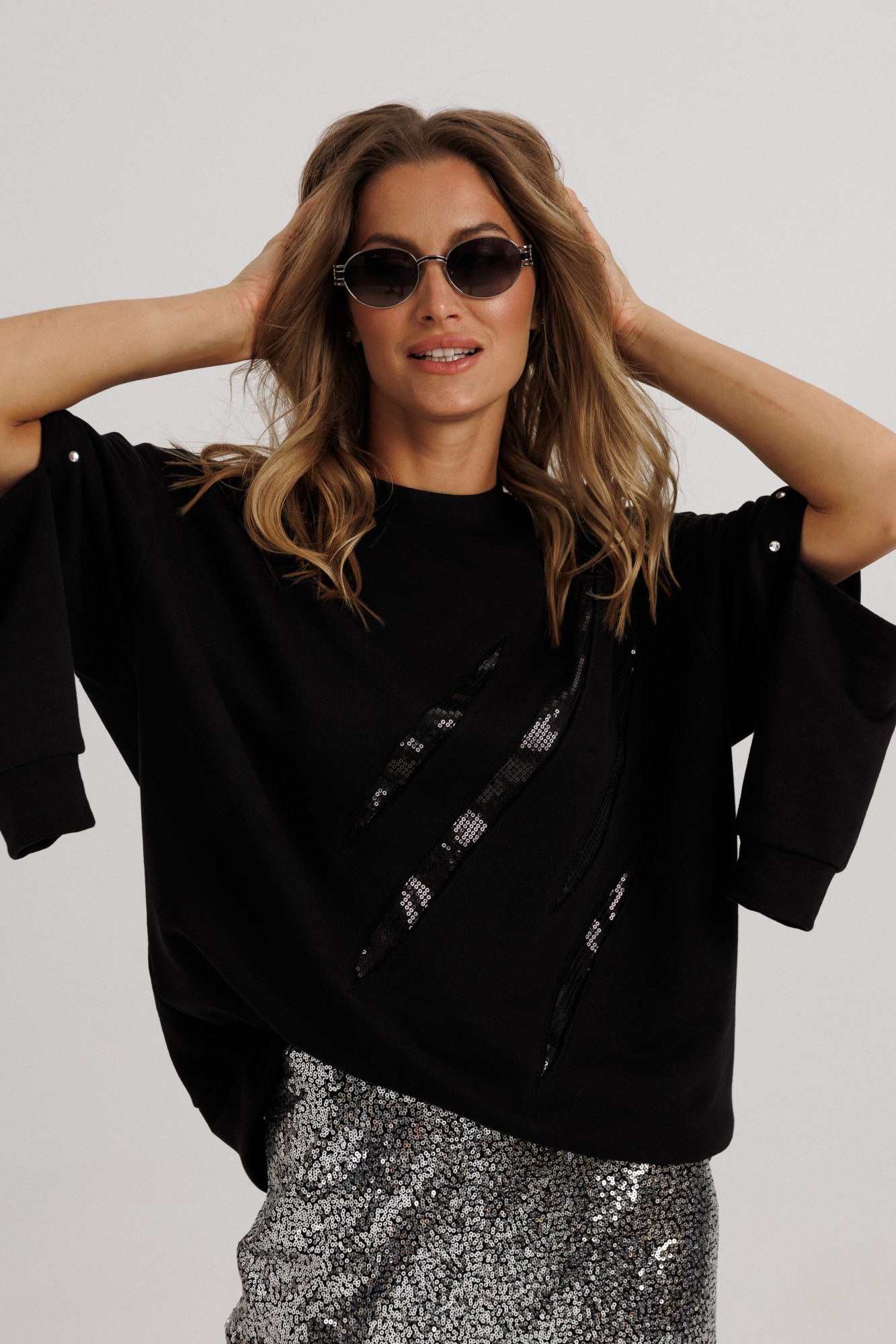 Стильный комплект, состоящий из эффектного оверсайз-блузона с декоративными вставками, рукавами-трансформерами удлиненной юбки из полотна с пайетками. Блузон из уютного трикотажного полотна, свободного прямого силуэта. Линия плеча спущена, рукав прямой, на зауженной манжете. Линия плеча состоит из притачного элемента: погона. Рукав основной состоит из двух деталей, в горизонтальном шве стачивания данных деталей расположен открытый разрез. По верхнему срезу расположены стразы. При желании длина рукава может трансформироваться и отверстием выступает открытый разрез. Длина рукава вместе с плечевой линией 75 см. Из них 13 см: длина плеча и 62 см: длина рукава. Высота манжета 5 см. На центральной части переда блузона расположены декоративные аппликационные элементы, в виде ассиметричных полос из пайеток. Горловина округлая, оформлена притачной планкой, высотой 3 см. Низ блузона оканчивается притачной манжетой, высотой 6 см. Длина блузона по спинке изделия 70 см. Юбка прямого силуэта, чуть зауженная к низу, выполнена из эффектного трикотажного полотна с пайетками, на подкладке. В среднем шве размещена потайная молния и открытый разрез. На линии талии размещены классические вытачки. Пояс внутренний, обтачной. Длина юбки по среднему шву 82 см. Высота разреза 32 см. (фурнитура может отличаться от представленной на рекламном фотоматериале). Особые рекомендации: рекомендуется холодная деликатная ручная стирка, без использования отбеливающих СМС, без интенсивного трения. Сушка в вертикальном положении. ВТО с минимальным паром.