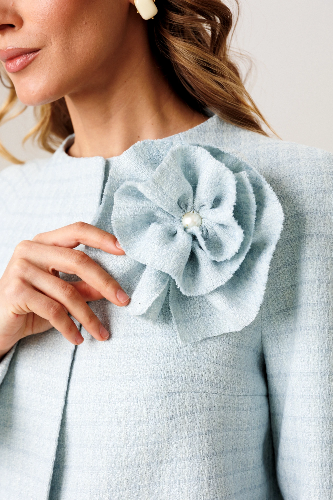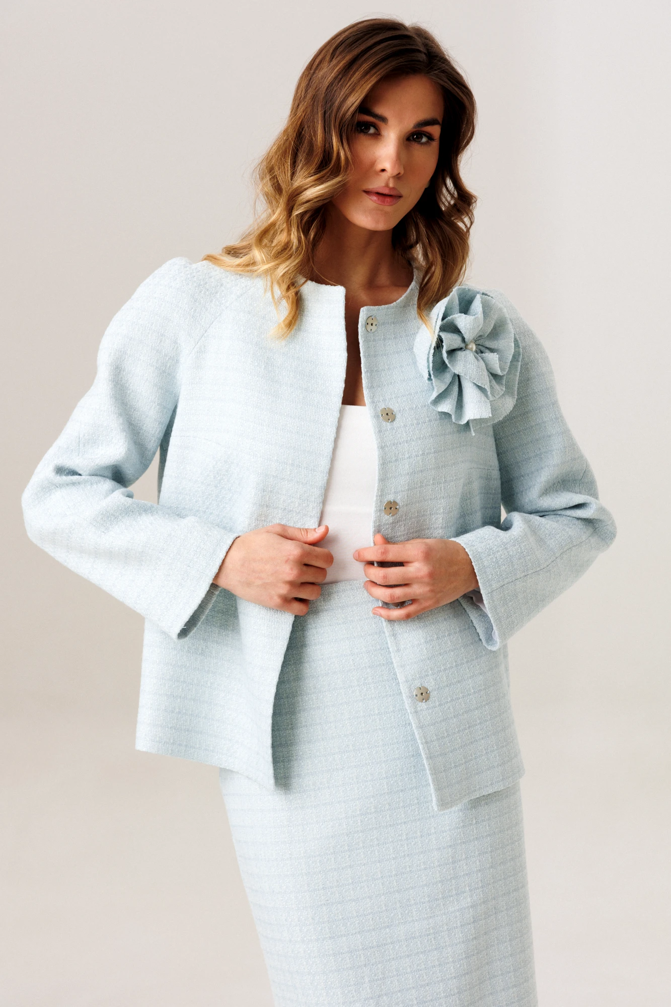 Эффектный комплект из фактурной ткани в стиле Одри Хепберн, состоящий из жакета, юбки и текстильного съемного украшения в виде цветка. Жакет свободного прямого силуэта на подкладке, чуть расклешенного к низу. Рукав-реглан, двухшовный, прямой. На полочке расположены горизонтальные вытачки. Горловина имеет незначительную цельнокройную стойку высотой 2,5 см. Застежка на притачные кнопки скрыта по вертикальному борту. Длина рукава: реглан с длиной плеча 71-72 см, длина изделия жакета по спинке 60-62 см (в зависимости от размерного ряда). Юбка комплекта прямого силуэта, на подкладке, слегка заужена к низу. Линия талии оформлена обтачным поясом. На полочке и спинке расположены вытачки. В среднем шве изделия застежка на потайную молнию и открытый разрез, высотой 24 см. Длина юбки 69,5 см. Комплект дополнен съемным текстильным украшением в виде брошь-цветка. (фурнитура может отличаться от представленной на рекламном фотоматериале)/ Особые рекомендации: рекомендуется холодная деликатная ручная стирка, без использования отбеливающих СМС, без интенсивного трения. Сушка в вертикальном положении. ВТО с минимальным паром.