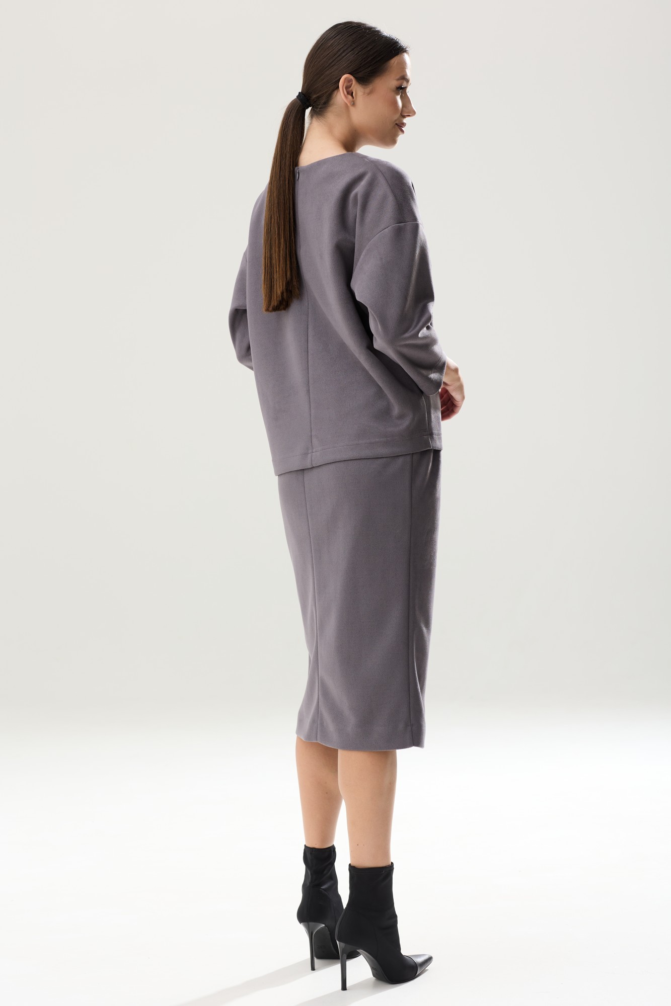Роскошный комплект: блузон и юбка из тканой замши глубокого тона.