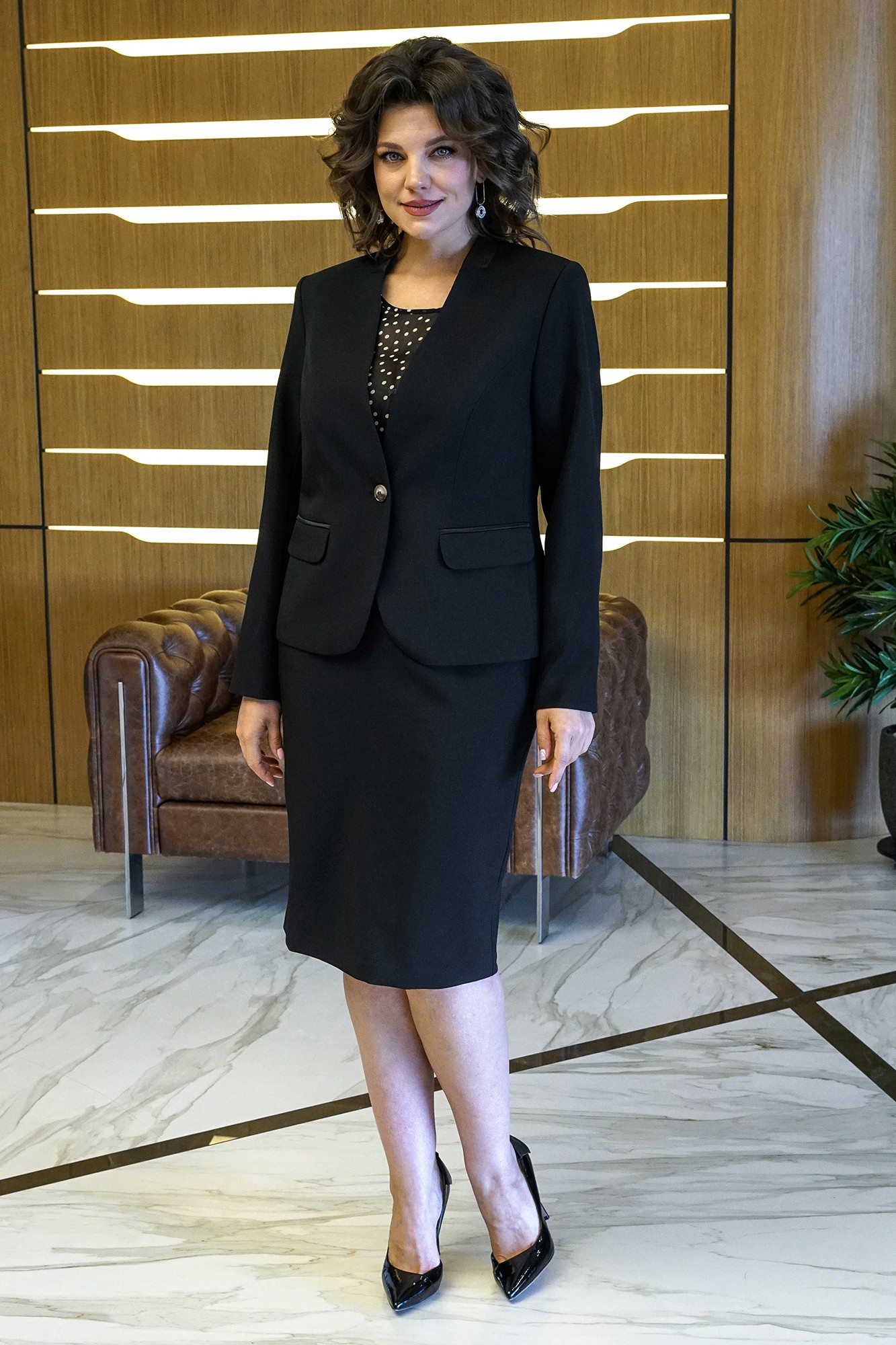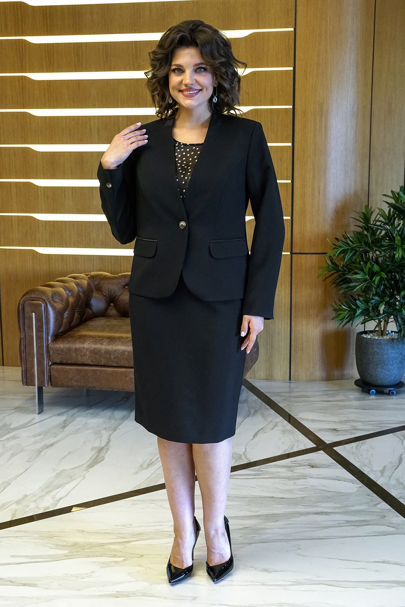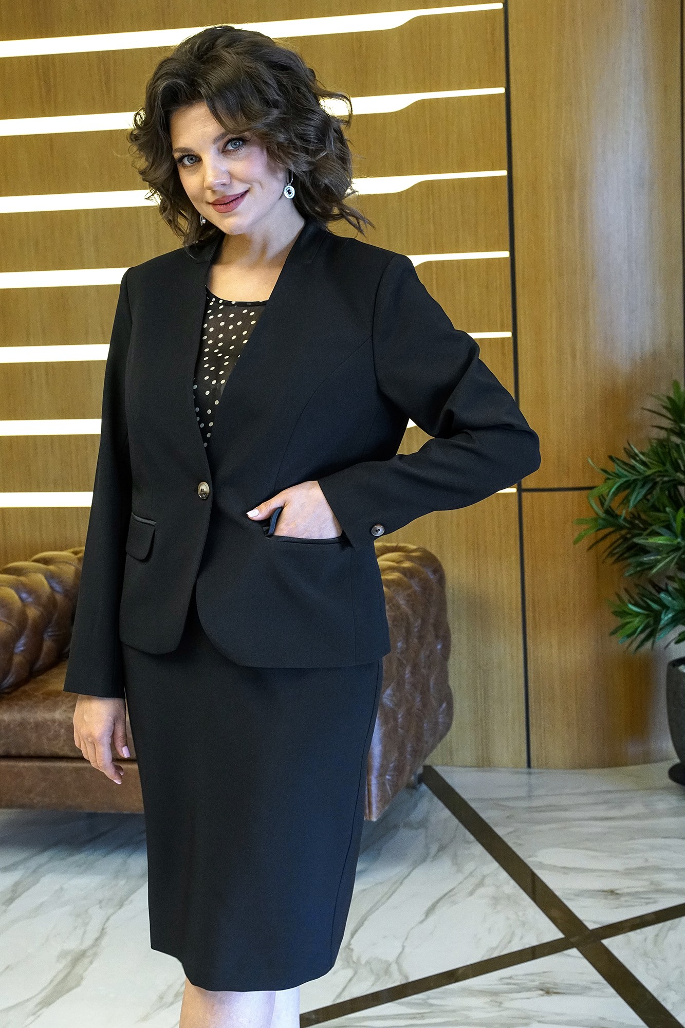 Лаконичный крой, модные цвета и идеальная посадка делают этот комплект-тройку актуальным во все времена! Жакет полуприлегающего силуэта с центральной застежкой на одну пробивную петлю и пуговицу. Перед с рельефными швами, с горизонтальными карманами с клапаном и двумя обтачками. Спинка со средним швом и рельефными швами, выходящими от линии проймы. Рукава втачные, двухшовные, низ декорирован пришивной пуговицей. Воротник – втачная стойка. Жакет на подкладке и с плечевыми накладками. Блуза полуприлегающего силуэта с фигурной линией низа. Перед с нагрудными вытачками. Застежка по центру горловины спинки на навесную петлю и пуговицу. Рукава – крылышко со сборкой по окату. Юбка зауженная к низу, на притачном поясе, застегивающемся на одну петлю и пуговицу. Застежка в среднем шве заднего полотнища на потайную тесьму-молнию. Переднее полотнище с таллиевыми вытачками. Заднее полотнище с таллиевыми вытачками и средним швом, заканчивающимся шпицей. Юбка на подкладке.