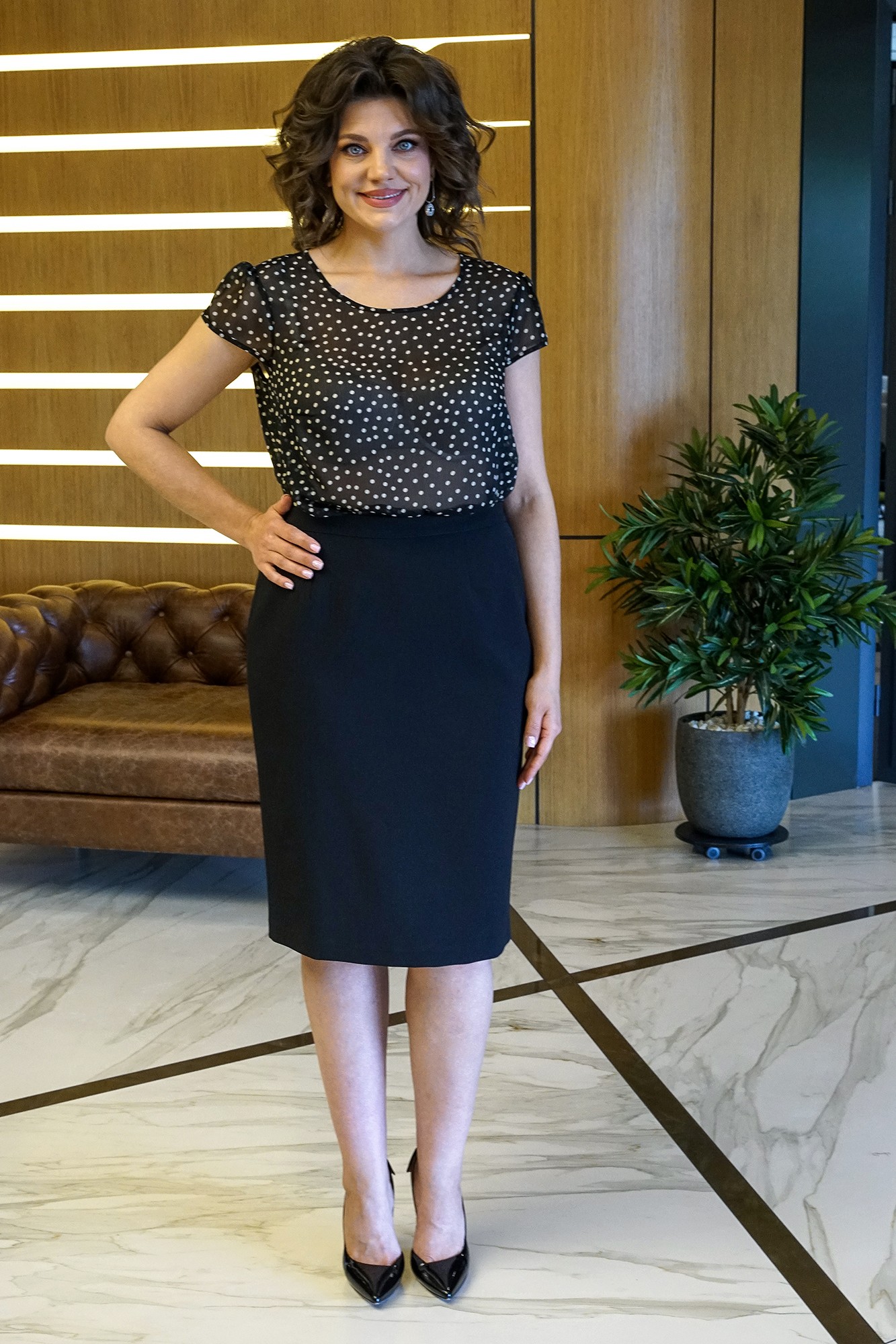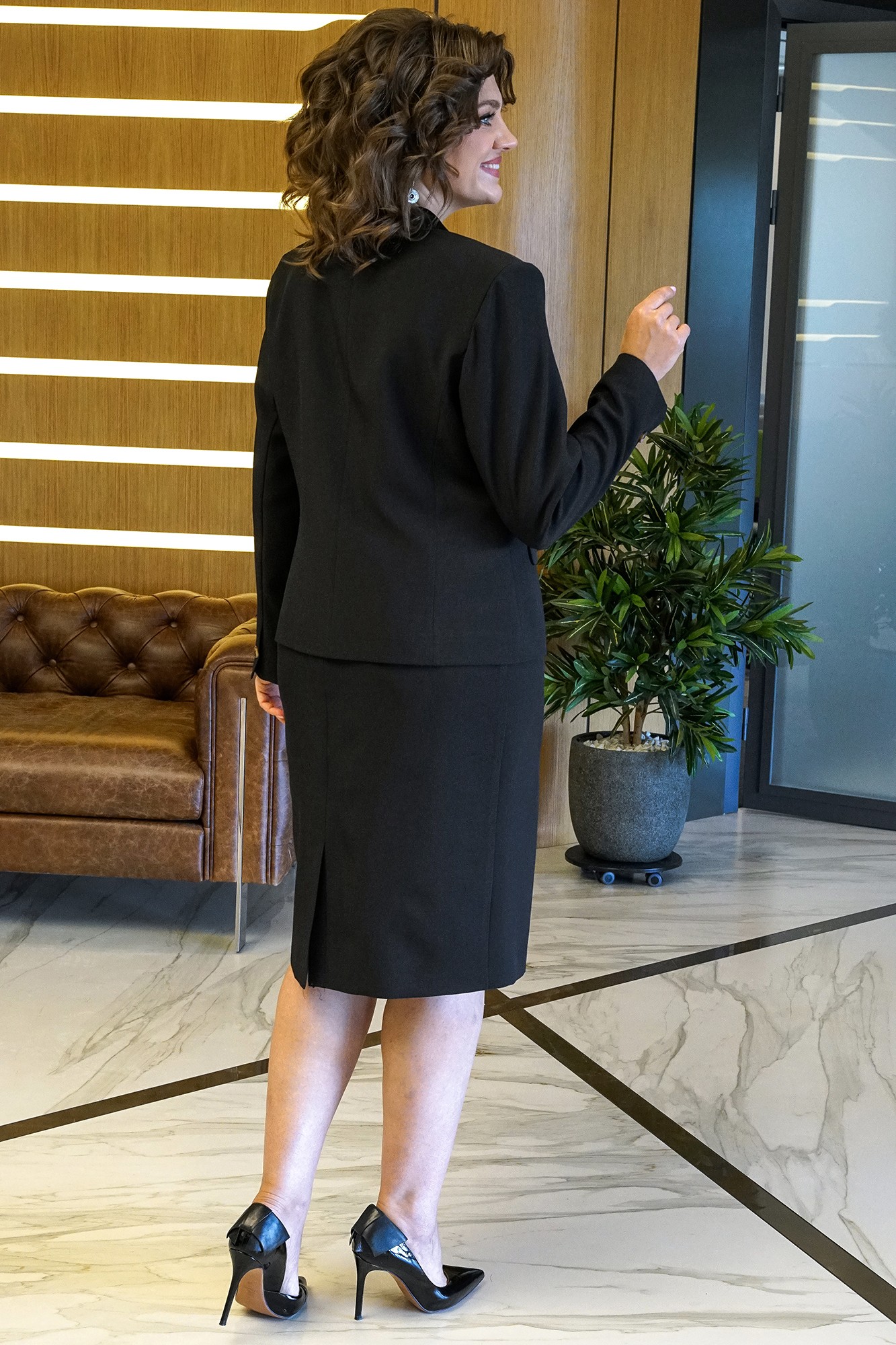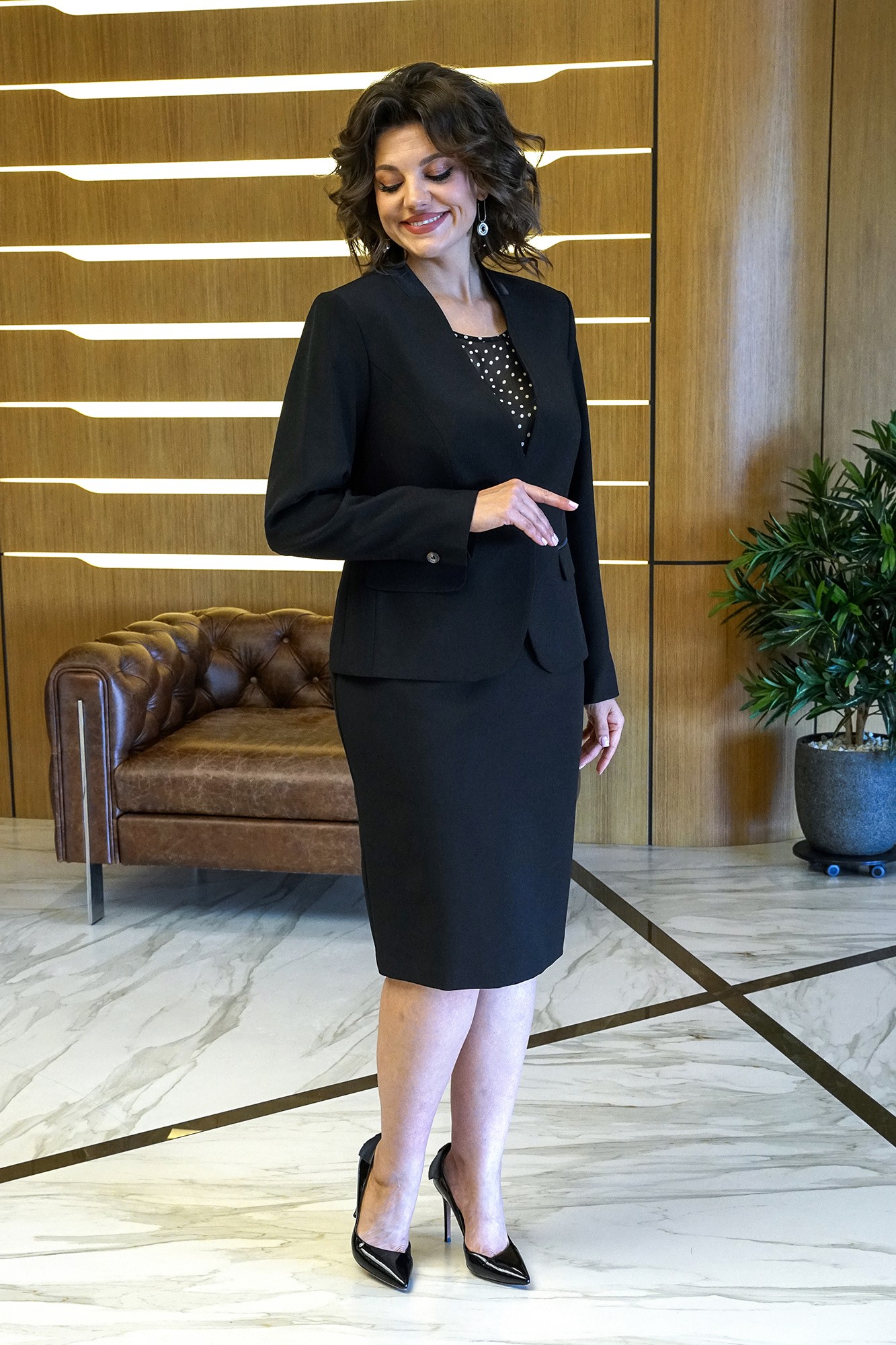 Лаконичный крой, модные цвета и идеальная посадка делают этот комплект-тройку актуальным во все времена! Жакет полуприлегающего силуэта с центральной застежкой на одну пробивную петлю и пуговицу. Перед с рельефными швами, с горизонтальными карманами с клапаном и двумя обтачками. Спинка со средним швом и рельефными швами, выходящими от линии проймы. Рукава втачные, двухшовные, низ декорирован пришивной пуговицей. Воротник – втачная стойка. Жакет на подкладке и с плечевыми накладками. Блуза полуприлегающего силуэта с фигурной линией низа. Перед с нагрудными вытачками. Застежка по центру горловины спинки на навесную петлю и пуговицу. Рукава – крылышко со сборкой по окату. Юбка зауженная к низу, на притачном поясе, застегивающемся на одну петлю и пуговицу. Застежка в среднем шве заднего полотнища на потайную тесьму-молнию. Переднее полотнище с таллиевыми вытачками. Заднее полотнище с таллиевыми вытачками и средним швом, заканчивающимся шпицей. Юбка на подкладке.