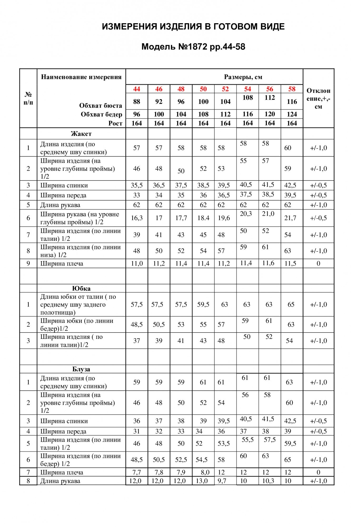 Таблица размеров