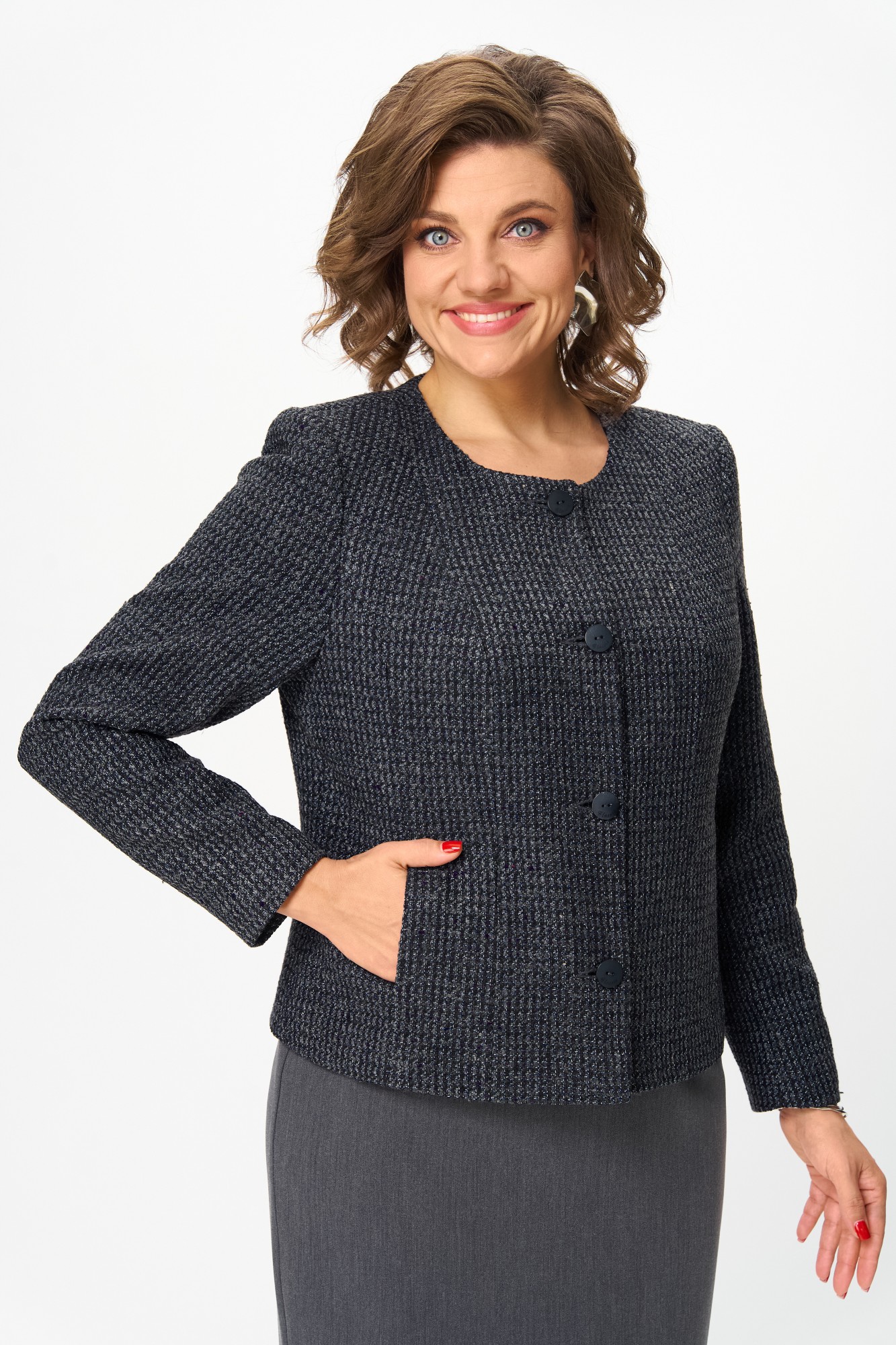 Комплект состоит из жакета и юбки. Жакет выполнен из твида, юбка из однотонной костюмной ткани.