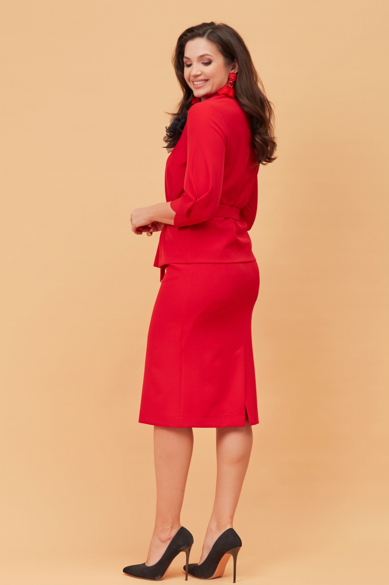 Костюм женский, состоящий из блузки и юбки. Блузка прямого силуэта с воротником «шаль». Перед с нагрудными вытачками и складкой по середине. Рукав втачной одношовный со складками и манжетами по низу. Блузка со съемным поясом с пряжкой. Изделие без подкладки.