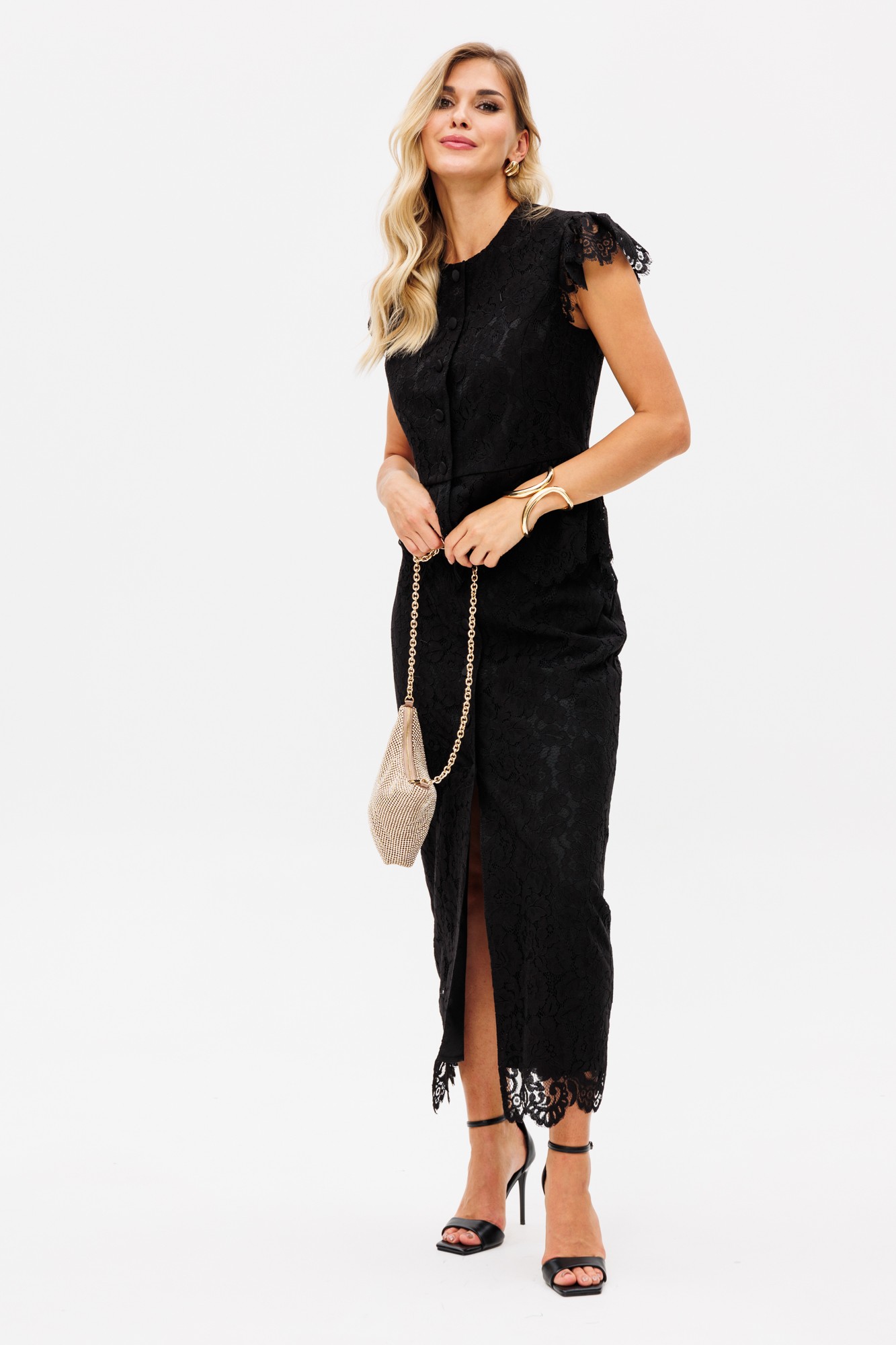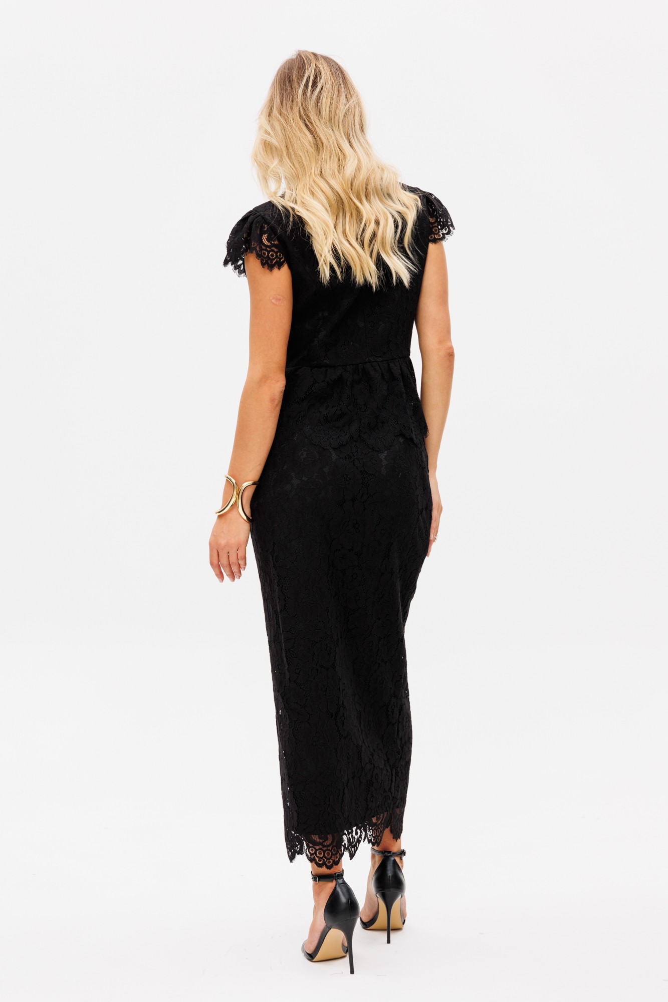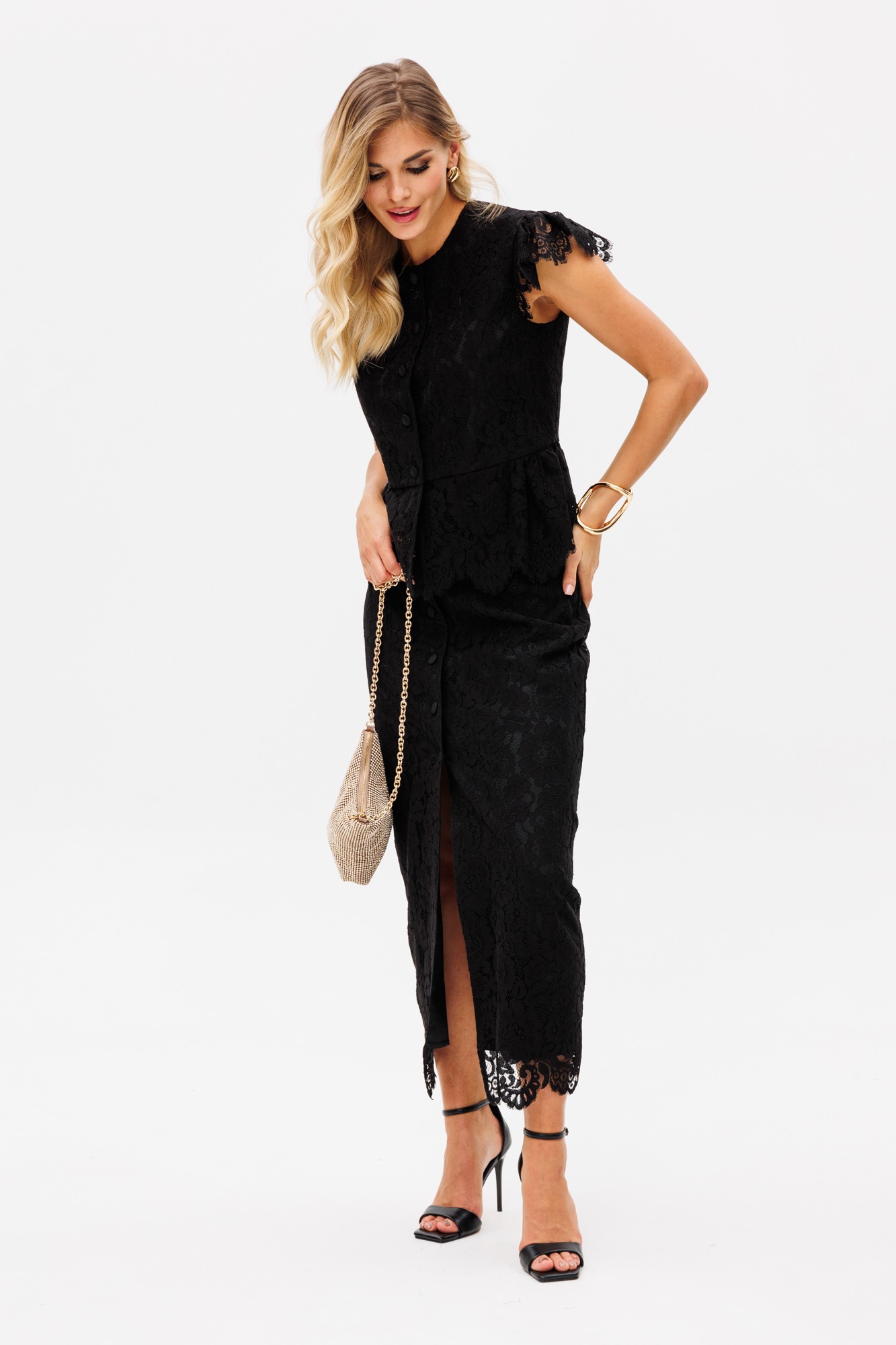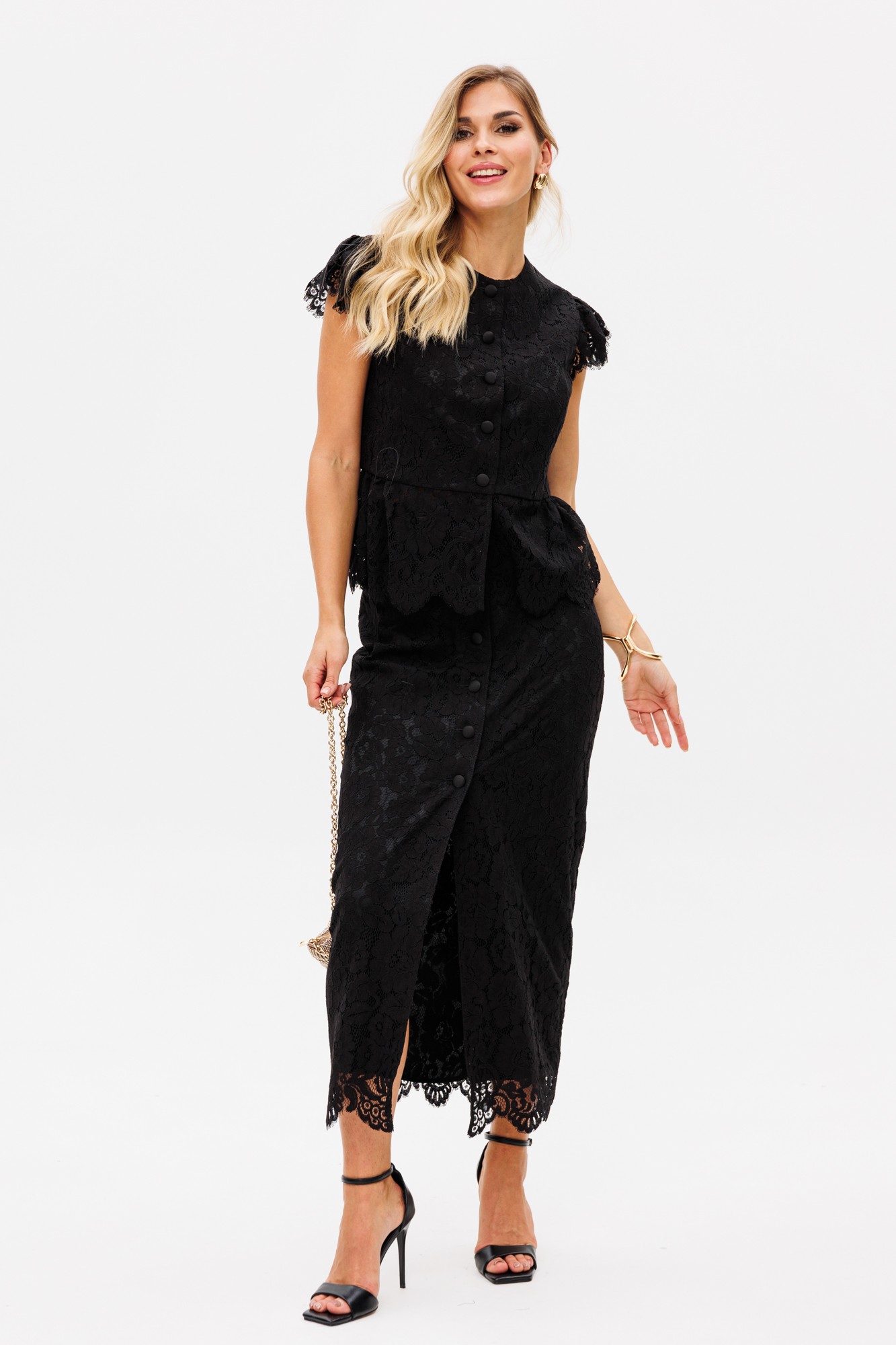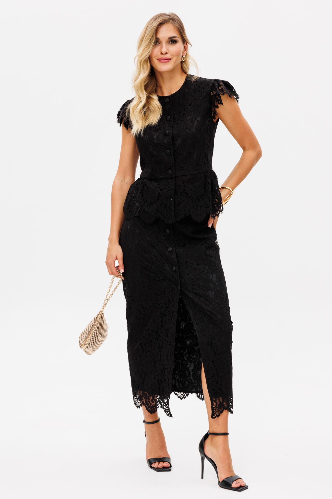 Комплект: блузка + юбка. Комплект выполнен из гипюра. Блузка приталенного силуэта, длиной выше линии бедер, отрезная по линии талии. Спереди рельефы и центральная застежка на пуговицы. Горловина округлой формы. На спинке рельефы. Рукав-крыло по окату. Низ блузки в виде баски, присборенной по линии талии. По низу рукавов и баски фестоны. Блузка на притачной по низу подкладке. Юбка зауженная к низу, длиной миди, на притачном поясе. Спереди центральная застежка на пуговицы. По низу юбки фестоны. Юбка на отлетной по низу подкладке.