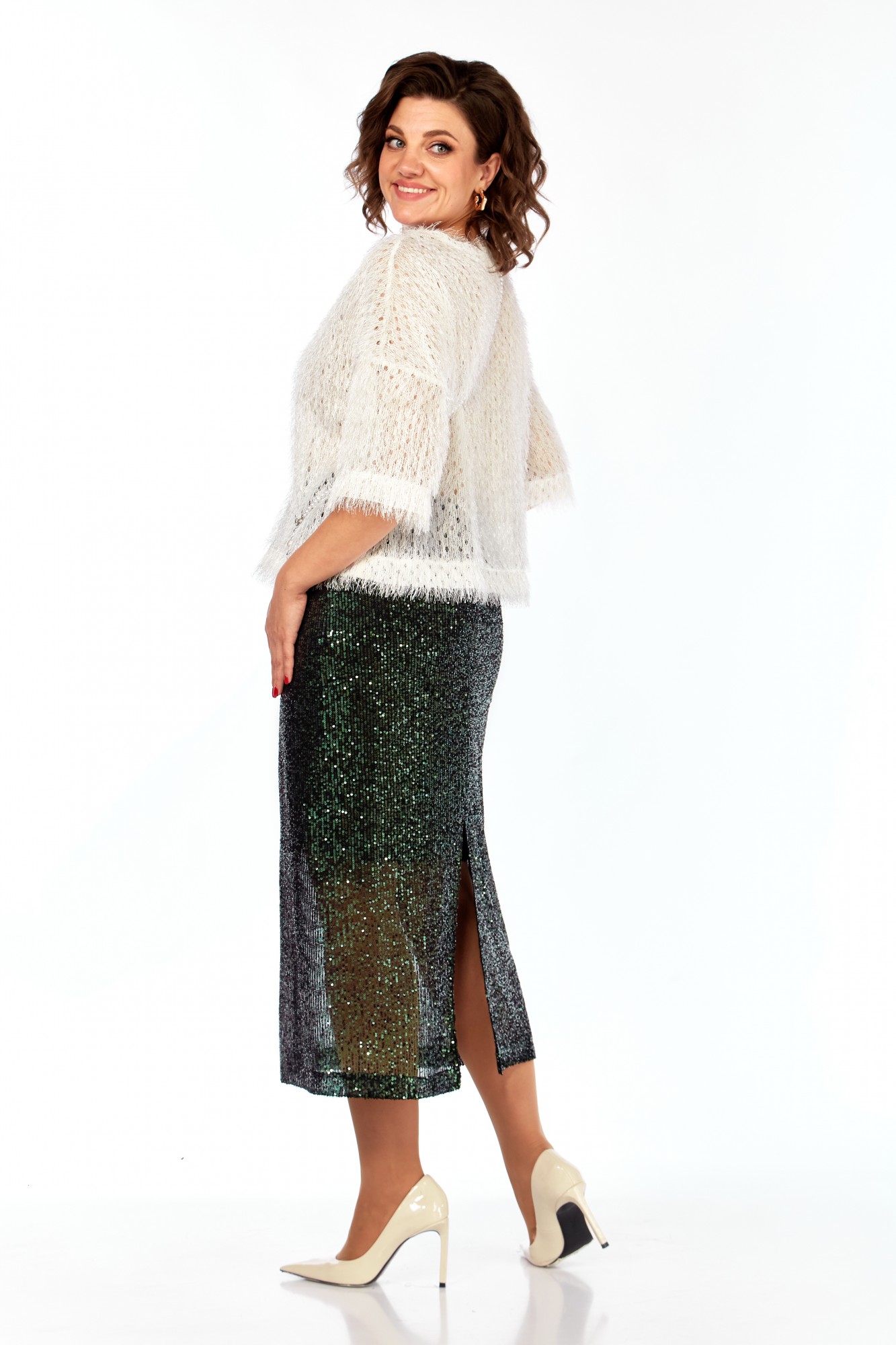 Шикарный комплект, сочетающий мягкую бахрому и пайетки -must-have сезона. Блузка нарядная прямого силуэта, из интересной ткани с бахромой. Вырез горловины округлой формы, со спущенным рукавом длиной 3/4. Юбка длиной миди на поясе (резинка по бокам) из отделочной атласной ткани. По спинке средний шов, в который вставлена потайная молния и заканчивающийся разрезом длиной выше колена. Юбка на подкладке.