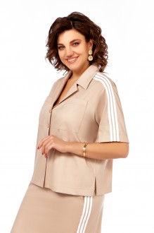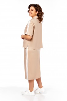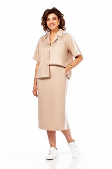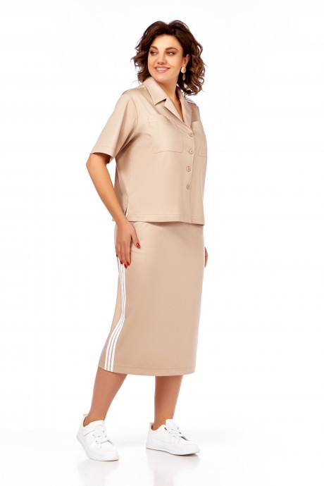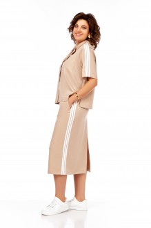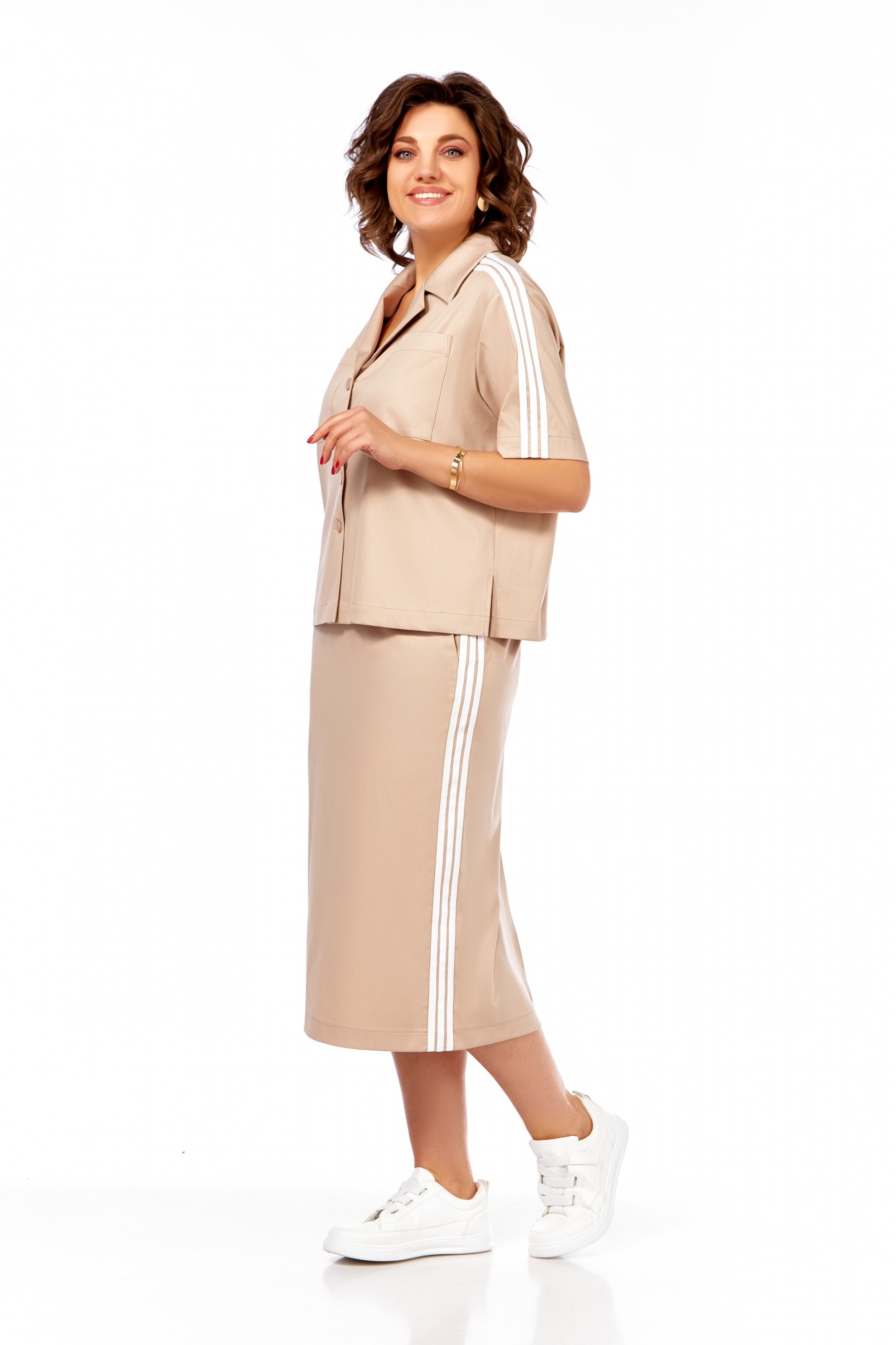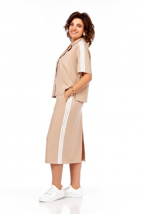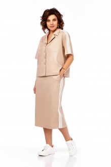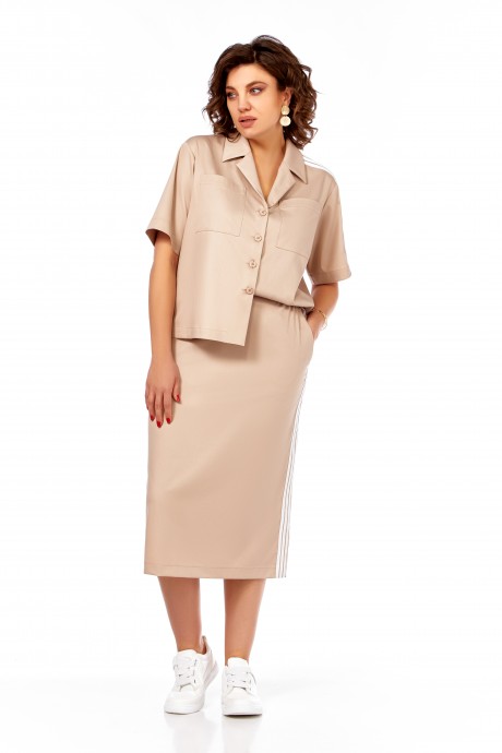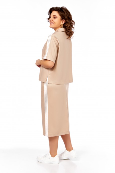 Шикарный костюм в стиле спорт-шик. Жакет с коротким рукавом, воротник пиджачного типа. На полочке накладные карманы в верхней части, разрезы в боковых швах. Без подкладки. На левом плече и рукавах настрочены декоративные полоски. Юбка прямая, длиной миди, по спинке разрез и молния потайная. Пояс на резинке по бокам. По боковым швам настрочена декоративная тесьма, карманы в боковых швам.