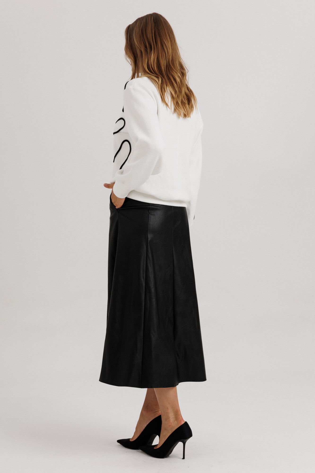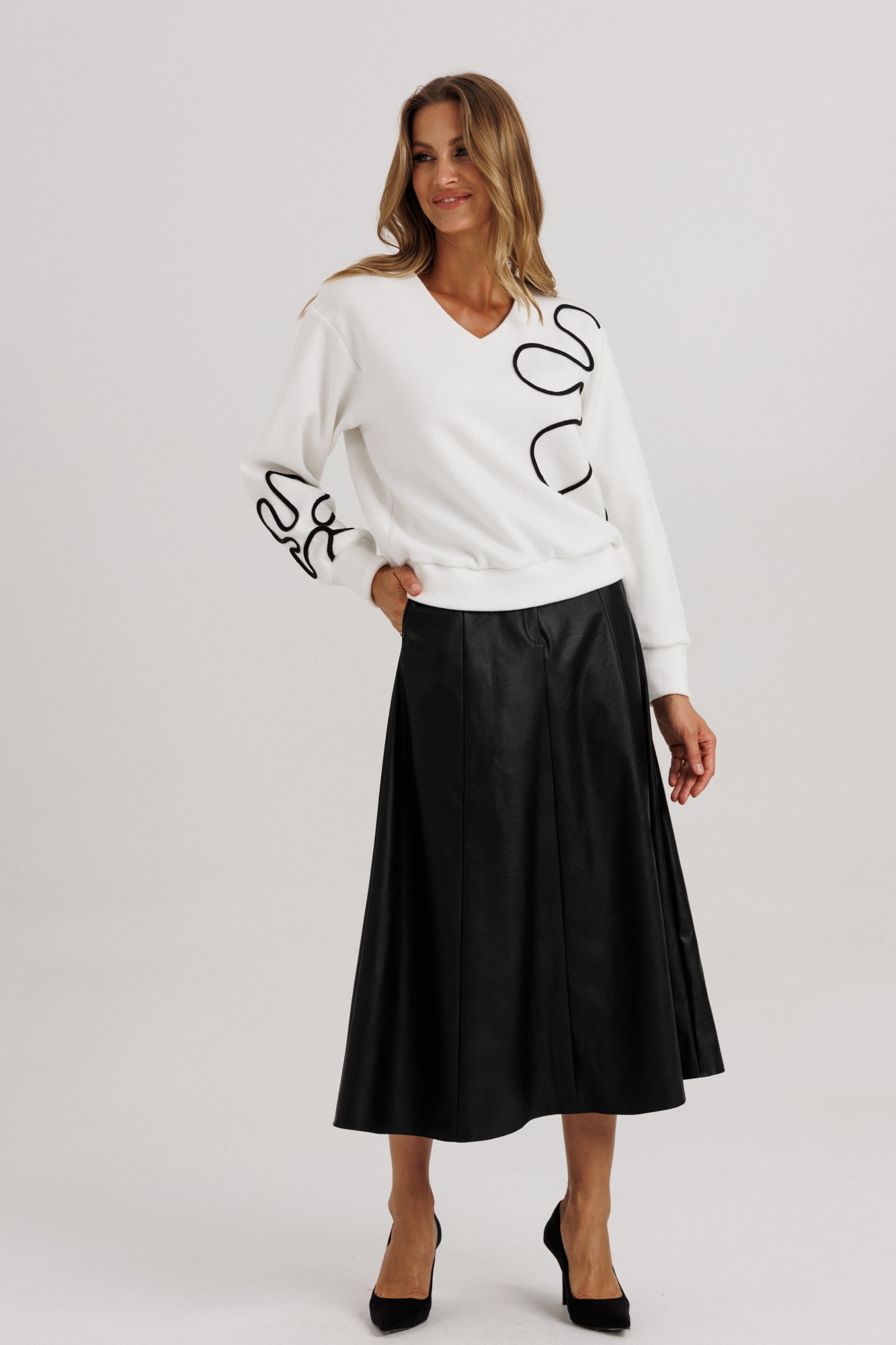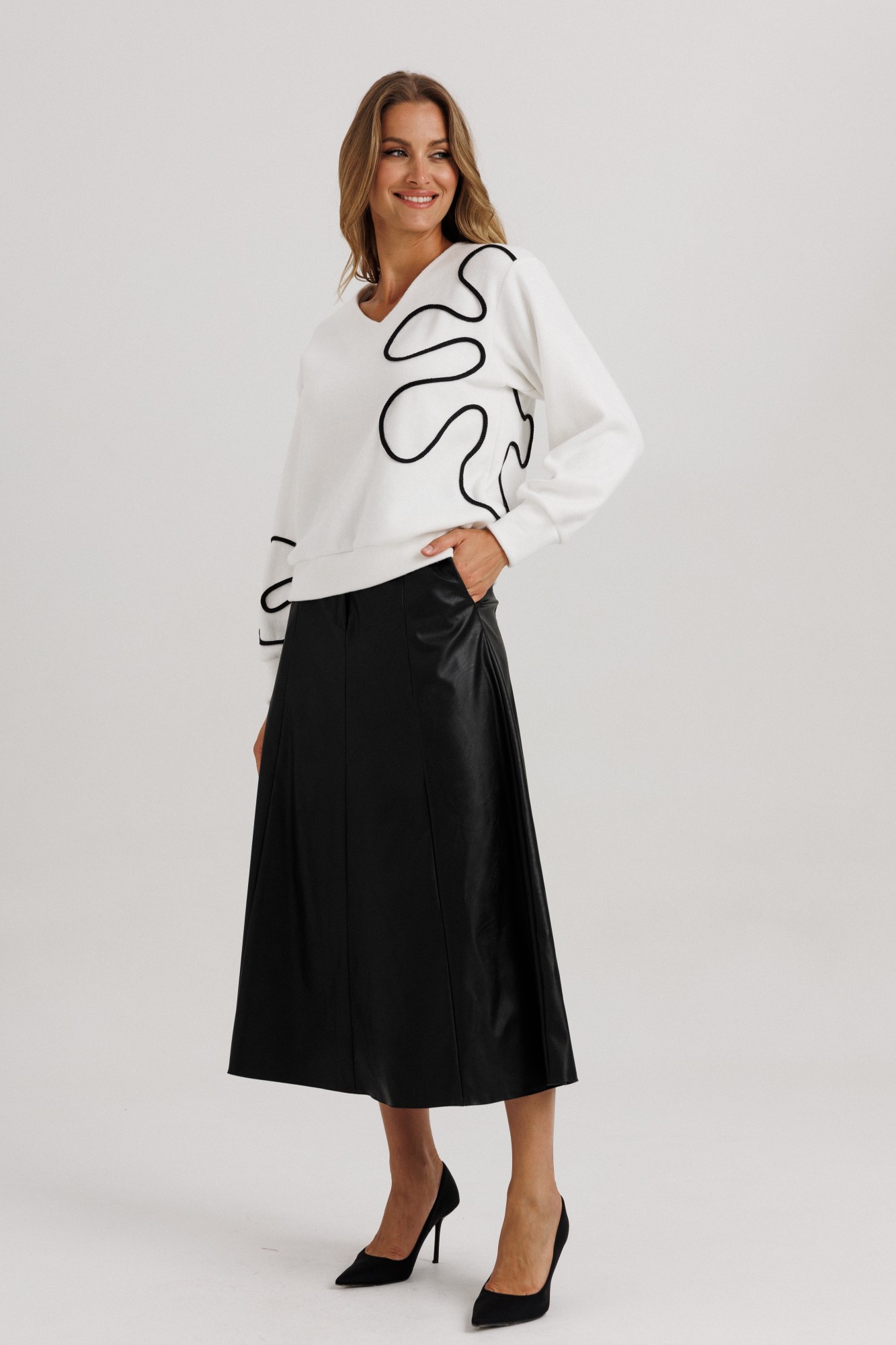 Эффектный комплект, состоящий из элегантного блузона с кантом и удлиненной юбки из клиньев. Блузон из уютного трикотажного полотна, свободного прямого силуэта. Линия плеча чуть спущена, рукав прямой на зауженной манжете. Длина рукава вместе с плечевой линией 78 см. Из них 13 см: длина плеча и 65 см: длина рукава с напуском. Высота манжета 8 см. Декоративным элементом блузона выступает контрастный рисунок, напоминающий элементы лепестков цветочного узора. Расположены эти элементы асимметрично: на одном из рукавов, также полочке и частично в боковом сегменте спинки блузона. Рисунок создан трикотажным кантом. Горловина оформлена угловым вырезом на полочке и оформлена притачным обтачным элементом. Низ блузона оканчивается притачной манжетой, высотой 7,5 см. Длина блузона по спинке изделия 61 см. Юбка выполнена из эко-кожи, состоит из восьми клиньев, с умеренным расширением по низу изделия. В боковых швах расположены наклонные функциональные карманы. В центральном шве полочки расположена застежка на молнию. Линия талии обработана притачным поясом со шлевочными держателями. В боковых сегментах пояса вставлена эластичная тесьма для дополнительного регулирования объема талии. Высота пояса 4,5 см. Застежка в поясе на две функциональные петли/пуговицы. (фурнитура может отличаться от представленной на рекламном фотоматериале). Особые рекомендации: рекомендуется холодная деликатная ручная стирка, без использования отбеливающих СМС, без интенсивного трения. Сушка в вертикальном положении. ВТО с минимальным паром.