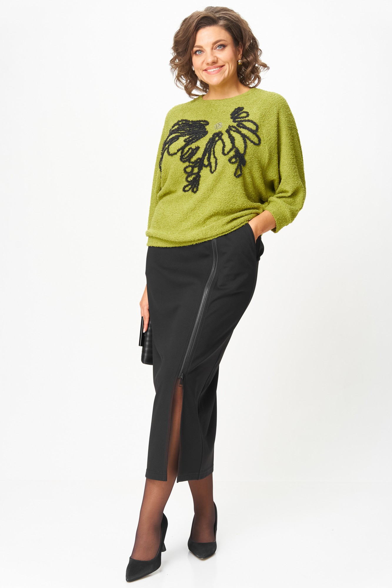Джемпер выполнен из плотного трикотажа, с круглой горловиной и рукавами реглан «летучая мышь». Перед украшен изящной вышивкой, что придает изделию нарядный вид. Манжеты на рукавах и по низу выполнены из основной ткани.