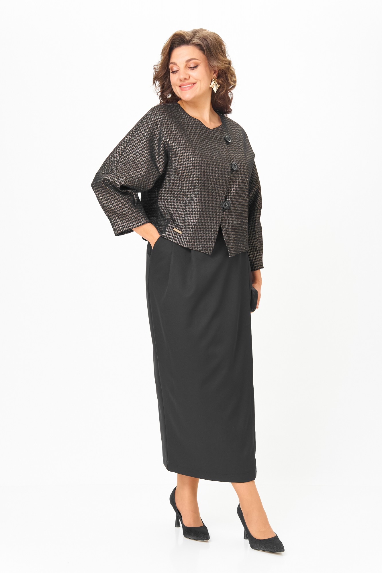 Жакет с люрексовой золотой нитью и юбка с мягким запахом образуют безупречный дуэт стиля и уверенности.