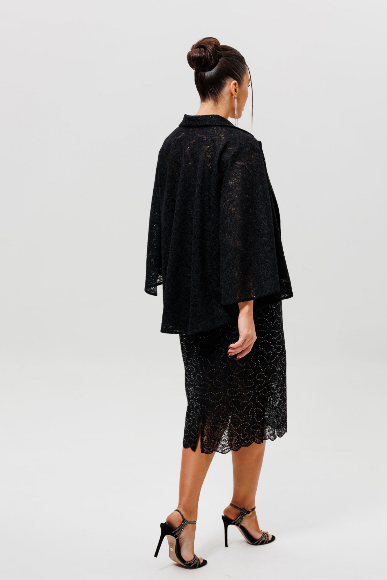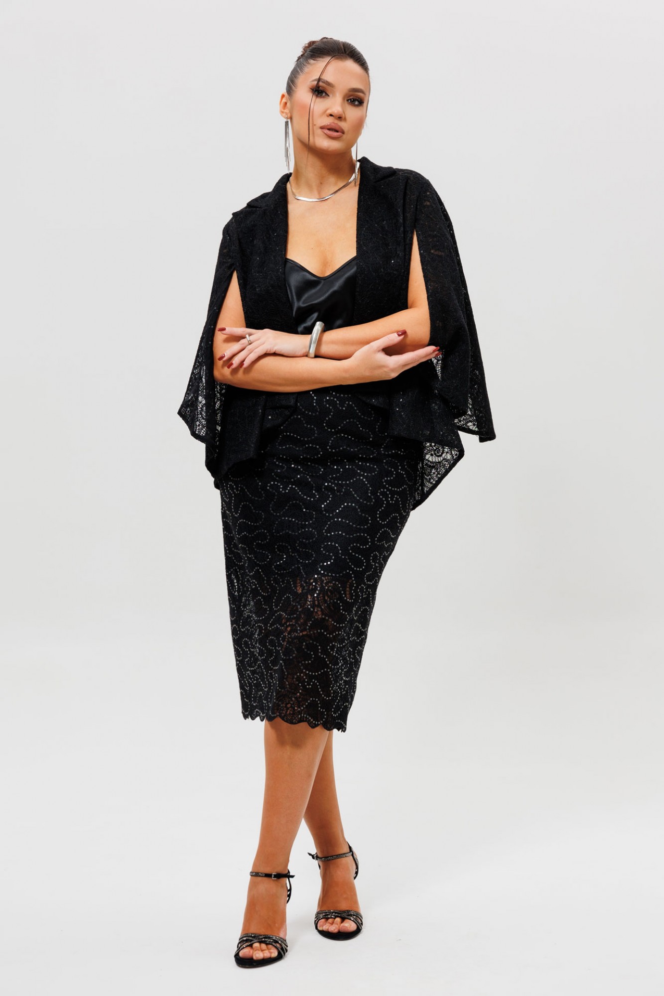 Костюм (жакет и юбка на подкладке) выполнен из кружевной ткани на основе сетки. На ткани пришиты пайетки, которые придают лёгкое мерцание. В кейпе низ изделия и низ рукава фигурные. Силуэт прямой, расширен к низу. Воротник пиджачного типа. Рукав пришит только по окату верхней части, что придаёт эффект отлетного рукава. Всё изделие обработано сеткой в цвет ткани с изнаночной стороны. Юбка на подкладке, прямого силуэта, заужена к низу. На переднем полотнище юбки обработаны талиевые вытачки. На заднем полотнище юбки есть средний шов, который заканчивается разрезом. Обработаны талиевые вытачки. Представляем готовый костюм с кейпом и юбкой, создающий целостный и невероятно эффектный образ для самого особого случая. В комплект входит черный кружевной кейп (Арт. 1278) с мерцающей изнутри отстрочкой-«змейкой» и соответствующая ему кружевная юбка, где та же самая декоративная отстрочка с пайетками выведена на внешнюю сторону, создавая перекликающиеся акценты. Такой костюм с накидкой — идеальное решение для свадьбы в качестве наряда для гостей, торжественного выхода в театр или романтического ужина. Юбка с пайетками и лаконичный кейп вместе создают гармоничный и запоминающийся ансамбль, подчеркивающий ваш утонченный вкус.