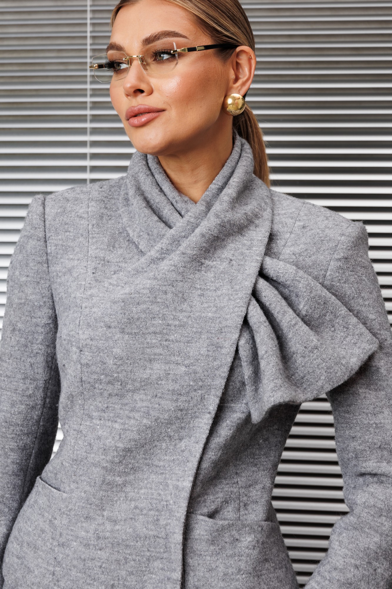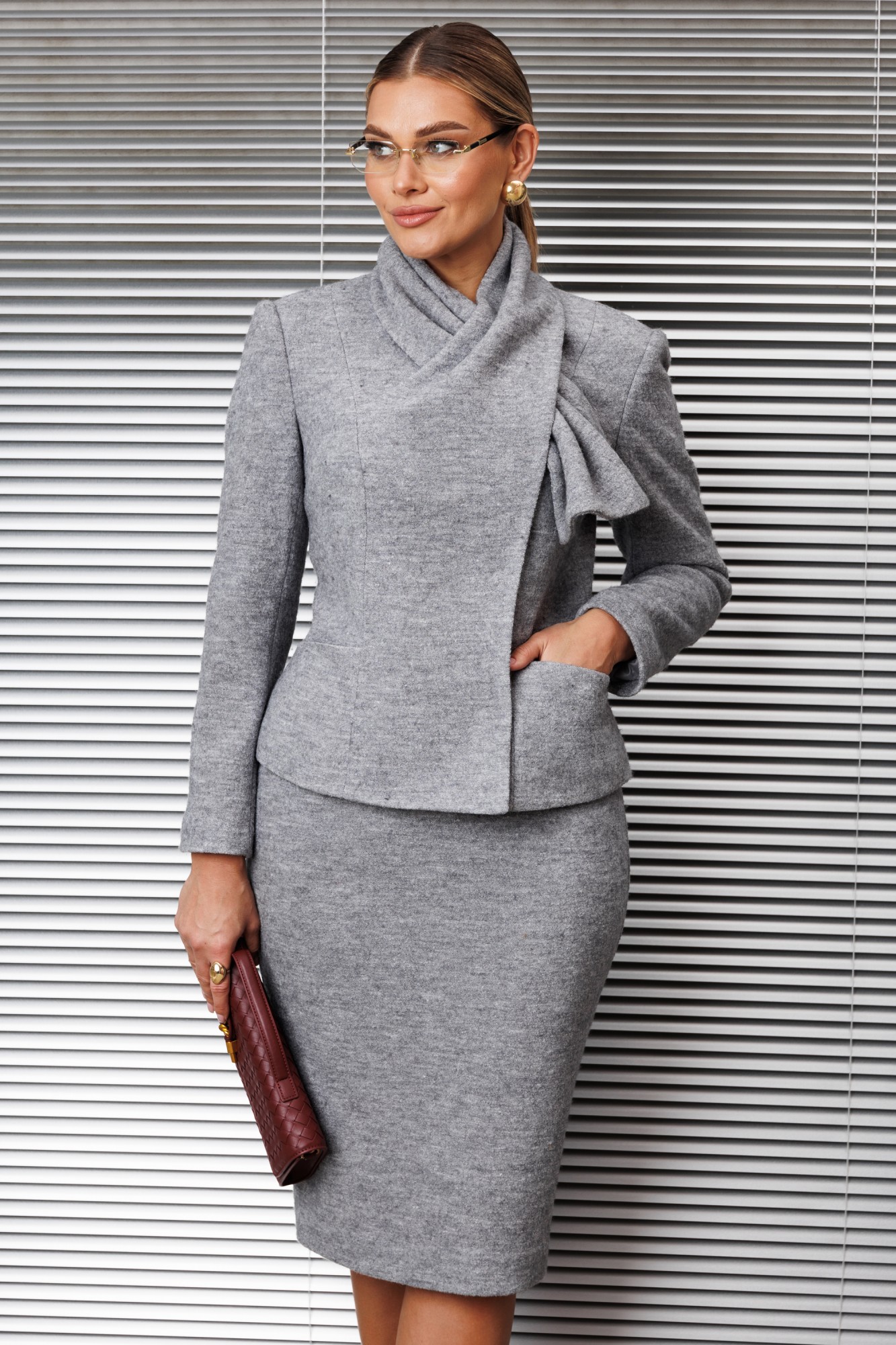 Комплект женский, состоящий из жакета и юбки. Жакет полуприлегающего силуэта с рельефами по переду и спинке. Полочка с карманами от рельефа до бокового шва. Застежка на кнопки и в верхней части на петли-пуговицы. В жакете оригинально оформлена линия горловины - в виде драпирующегося шарфа, что позволяет использовать его в прохладную погоду в качестве верхней одежды. Юбка прямая, зауженная к низу, сверху на притачном поясе с резинками. Застежка на тесьму-молнию в среднем шве, которая переходит в шлицу. Костюм на подкладке.