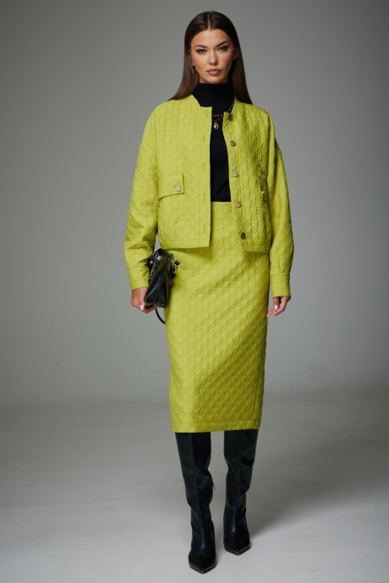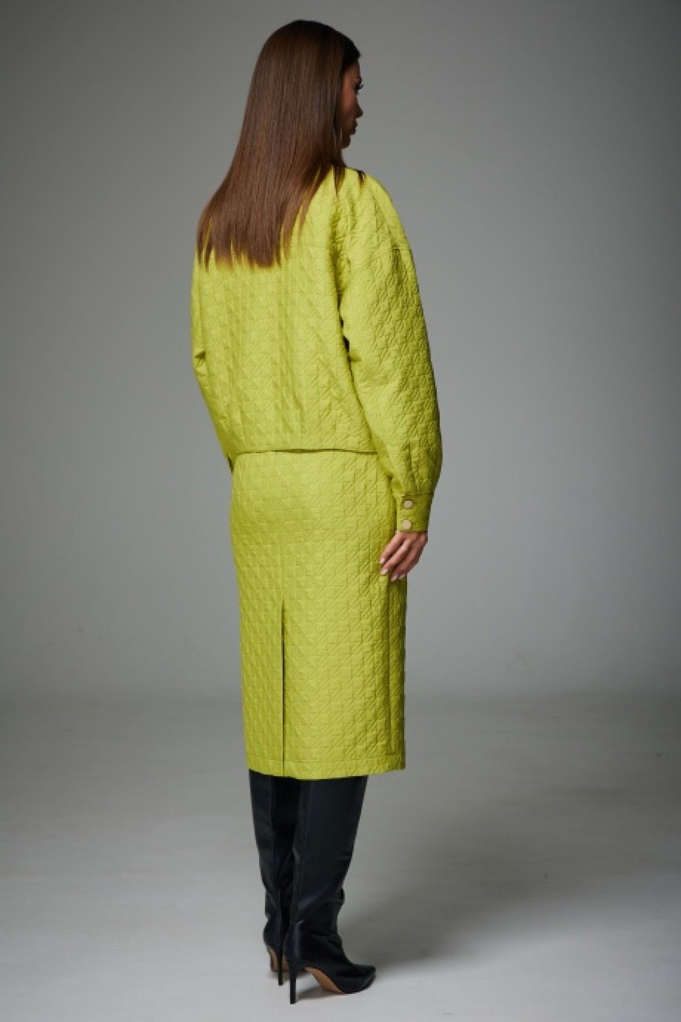 Юбка прямая, к низу заужена, с завышенной талией (цельнокроеным поясом). На переднем полотнище талевые вытачки расположены попарно. На заднем полотнище расположен средний шов со шлицей и застежкой на тесьму – «молнию», а также расположены талевые вытачки.