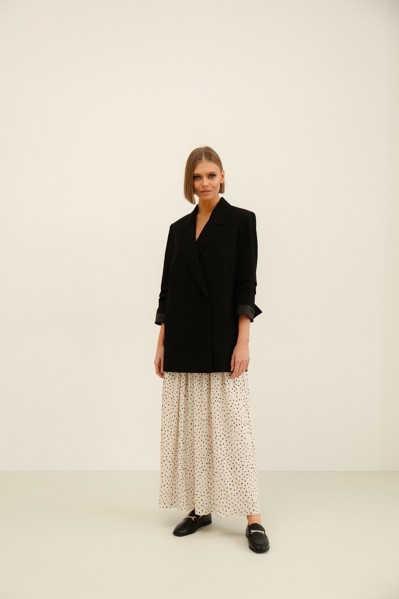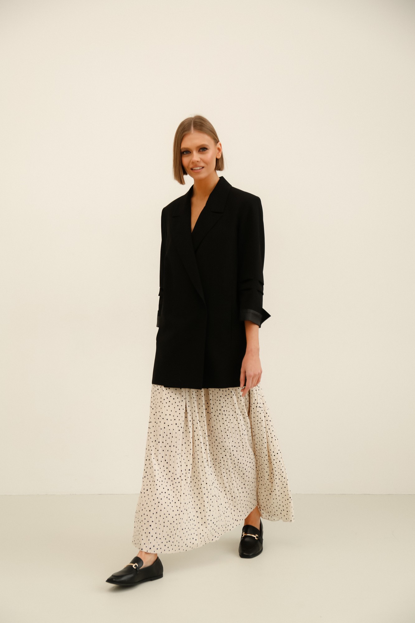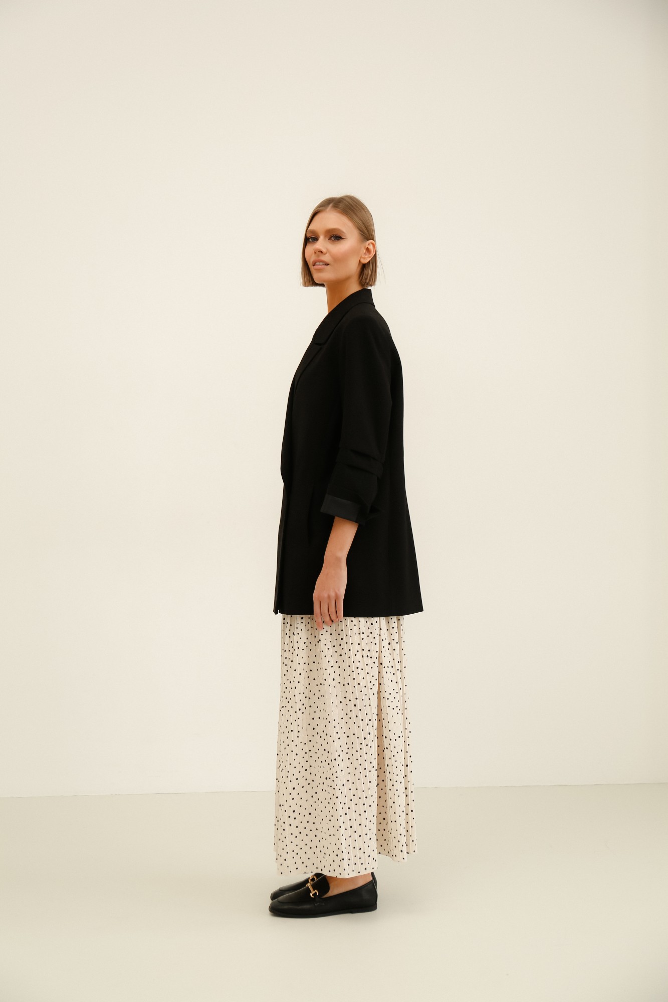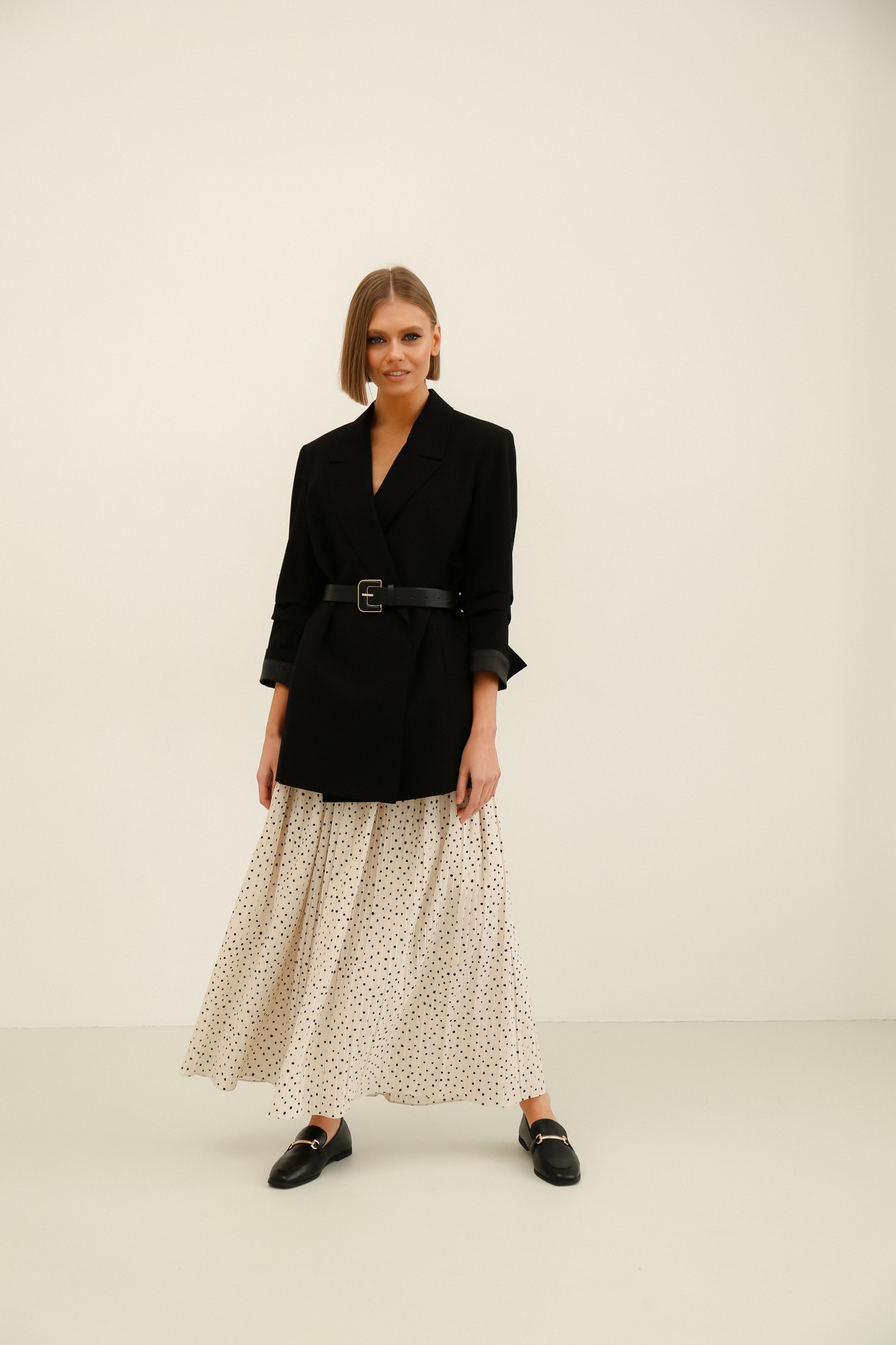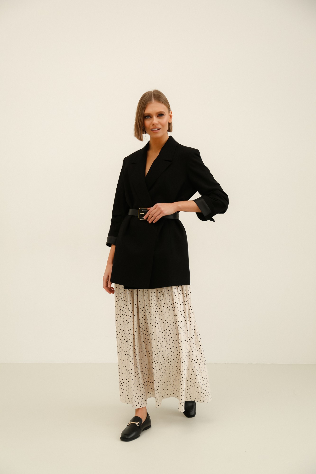 Стильный комплект, состоящий из жакета и длинной юбки. Жакет прямой, застегивается на пришитые потайные кнопки, ремень в комплекте. Рукава декорированы пришиты складками с подворотом. Юбки длинная, на тонкой подкладке, не просвечивает. Пояс на резинке, хорошо тянется. Длина юбки 89 см. Жакет: длина 76 см, рукав 47 см.