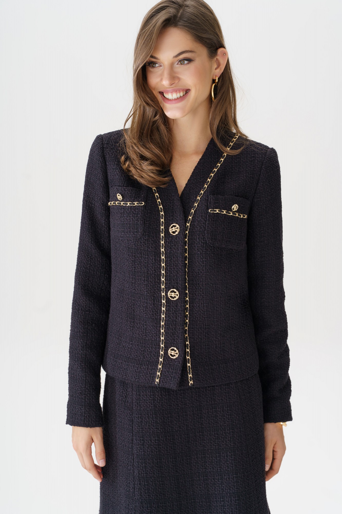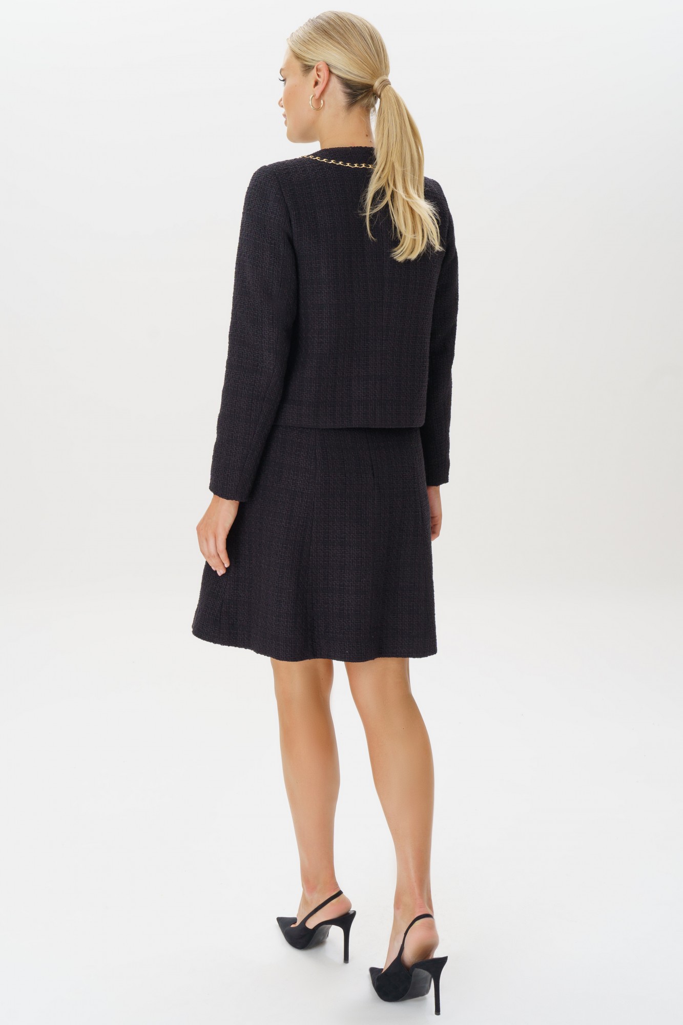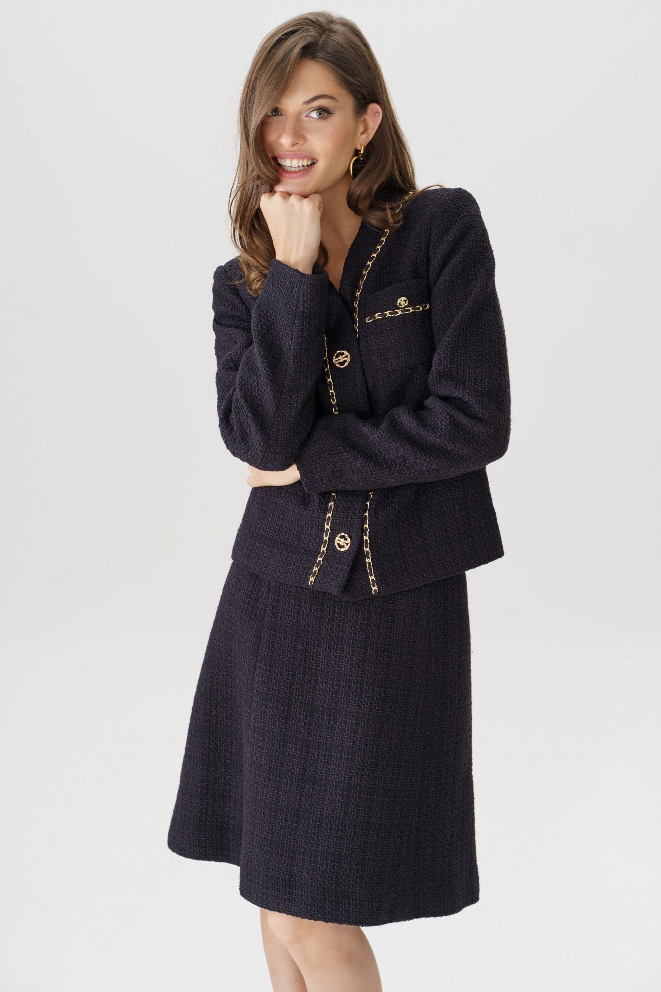 Элегантный твидовый костюм с юбкой — это воплощение классического стиля и утонченности. Жакет с изысканной отделкой золотой цепочкой и пуговицами добавляет нотку роскоши и подчеркивает изящность силуэта. Юбка расширенная к низу обеспечивает комфорт и идеальную посадку, создавая гармоничный и женственный образ. Этот комплект идеально подойдет для деловых встреч, стильных мероприятий или прогулок, где требуется выглядеть элегантно и уверенно. Сочетайте с минималистичными украшениями и обувью на каблуке, чтобы завершить безупречный образ. Костюм женский двухпредметный, состоит из жакета прямого силуэта на подкладке и юбки конического силуэта на отлетной подкладке. Костюм может быть как повседневной носки так и нарядный, выполнен из костюмно-плательной ткани рогожка с люрексом. Жакет женский с центральной бортовой застежкой на планку на 3 петли и пуговицы (фурнитура может незначительно отличаться от фото). По переду стачаны нагрудные вытачки идущие от бокового шва. На уровне линии груди накладные карманы, с отделкой в виде тесьмы и пуговицы (фурнитура может незначительно отличаться от фото). Горловина переда V- образной формы, обтачная. Спинка со средним швом и притачной планкой по горловине. По планке переда, горловине и карманам идет декоративная отделочная тесьма с цепью. Рукава втачные двухшовные длинные. Юбка женская конического силуэта (расширенная к низу) на отлетной подкладке. Перед юбки с 2-я вертикальными рельефными швами, идущими от пояса-кокетки до низа. Спинка юбки с 2-я рельефными швами и средним швом. В среднем шве юбки обработана застежка на потайную тесьму-молнию, которая идет до верха. Верхний край юбки обработан притачным поясом-кокеткой.