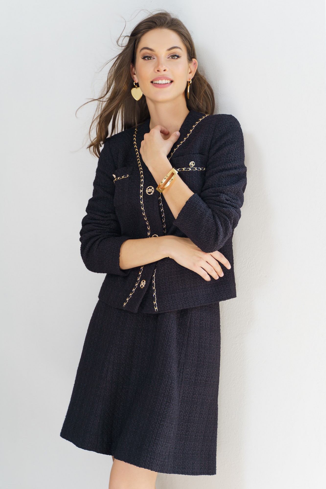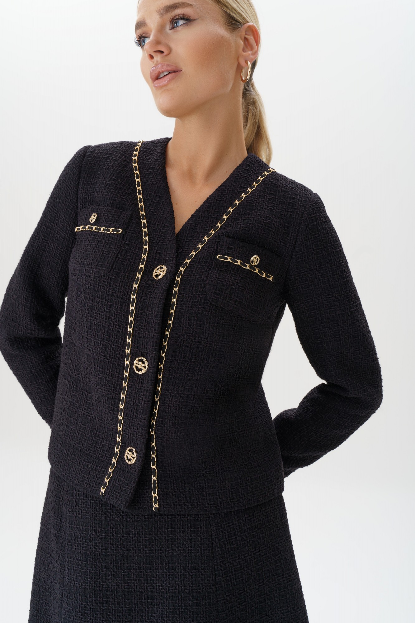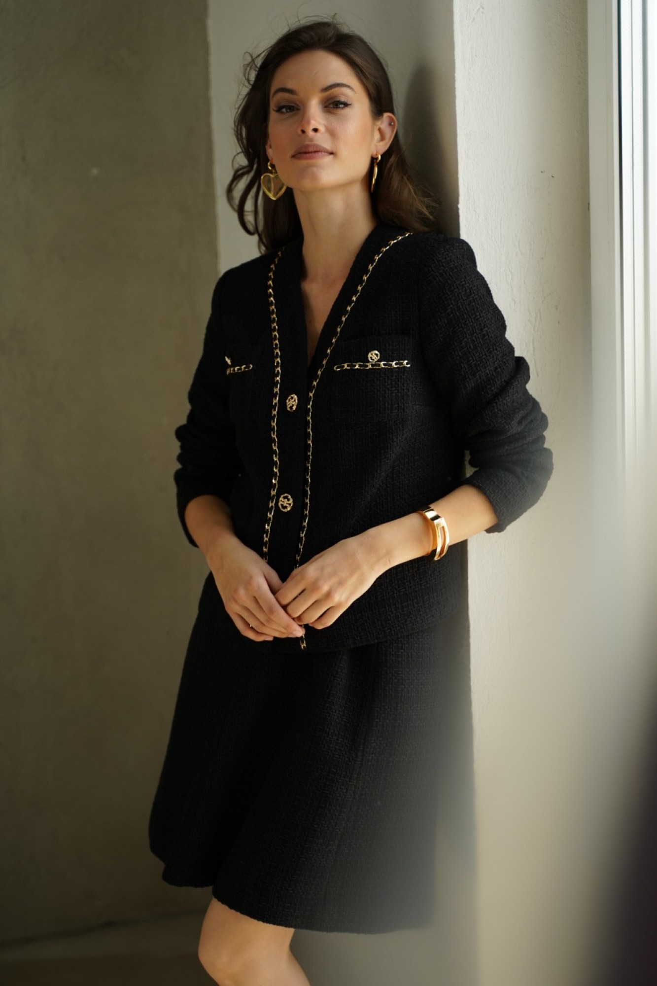 Элегантный твидовый костюм с юбкой — это воплощение классического стиля и утонченности. Жакет с изысканной отделкой золотой цепочкой и пуговицами добавляет нотку роскоши и подчеркивает изящность силуэта. Юбка расширенная к низу обеспечивает комфорт и идеальную посадку, создавая гармоничный и женственный образ. Этот комплект идеально подойдет для деловых встреч, стильных мероприятий или прогулок, где требуется выглядеть элегантно и уверенно. Сочетайте с минималистичными украшениями и обувью на каблуке, чтобы завершить безупречный образ. Костюм женский двухпредметный, состоит из жакета прямого силуэта на подкладке и юбки конического силуэта на отлетной подкладке. Костюм может быть как повседневной носки так и нарядный, выполнен из костюмно-плательной ткани рогожка с люрексом. Жакет женский с центральной бортовой застежкой на планку на 3 петли и пуговицы (фурнитура может незначительно отличаться от фото). По переду стачаны нагрудные вытачки идущие от бокового шва. На уровне линии груди накладные карманы, с отделкой в виде тесьмы и пуговицы (фурнитура может незначительно отличаться от фото). Горловина переда V- образной формы, обтачная. Спинка со средним швом и притачной планкой по горловине. По планке переда, горловине и карманам идет декоративная отделочная тесьма с цепью. Рукава втачные двухшовные длинные. Юбка женская конического силуэта (расширенная к низу) на отлетной подкладке. Перед юбки с 2-я вертикальными рельефными швами, идущими от пояса-кокетки до низа. Спинка юбки с 2-я рельефными швами и средним швом. В среднем шве юбки обработана застежка на потайную тесьму-молнию, которая идет до верха. Верхний край юбки обработан притачным поясом-кокеткой.