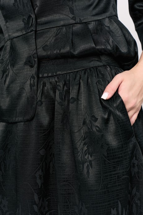 Жакет с центральной застёжкой на петли и пуговицы, отрезной баской и стояче-отложным воротником. Баска со складками по переду и спинке. Спинка со средним швом и двумя рельефами. Рукава цельнокроеные с изделием по переду и втачные по спинке. Жакет на подкладке. Изделие с брошью в верхней части (брошь входит в комплект).